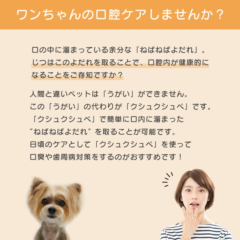 biasu【商品名】 (業務用) 中型犬用 口腔ケアスポンジ歯ブラシ クシュ クシュ ぺ Mサイズ【内容量】 50本入【メーカー/ブランド】 ハイアスピレーション【商品概要】 お口にたまった“ねばねばぬめり・よだれ”を取って口臭や歯周病対策! 「お口を綺麗に健康的に」 口の中に溜まっている余分な「ねばねばよだれ」。 じつはこのよだれを取ることで、口腔内が健康的に なることをご存知ですか? 人間と違いペットは「うがい」ができません。 この「うがい」の代わりが「クシュクシュぺ」です。 「クシュクシュぺ」で簡単に口内に溜まった “ねばねばよだれ” を取ることが可能です。 日頃のケアとして「クシュクシュぺ」を使って 口臭や歯周病対策をするのがおすすめです! 【使用方法】①最初にスポンジ部分を水で濡らし、水分を絞って下さい。 ②奥歯と歯茎の間に差し込み、奥から余分なよだれを掻きだします。 ③上下左右を掻き出したらスポンジを水で洗い、水分を絞って下さい。 ④スポンジを歯の奥から手前へ上下左右と擦ります。 ⑤再度スポンジを水で洗い、水分を絞って下さい。 ⑥最後に歯の内側と舌の間を奥から手前へ余分な唾液と汚れを掻き出します。 ご使用上及びお取扱い上のご注意 ・本品の使用上の注意をご確認の上ご使用下さい。 ・本品は使い切りの製品ですので再利用はしないで下さい。 ・水に浸したままにしないで下さい。 ・直射日光、高温多湿を避けて保管して下さい。 ・スポンジが棒から抜けたりちぎれた場合は速やかに取り除いて下さい。 【材質】 軸の材質:紙 スポンジ:ウレタン 【商品区分】 ペット用品 【広告文責】株式会社美アスTEL:086-728-5600・ご注文頂きメーカー発注後に欠品や終売になっている事が判明した場合には、ご注文をキャンセルさせて頂く事がございます。・掲載変更が間に合わず、商品画像とは違うデザイン(リニューアル後)の商品をお送りする事があります。・天然由来の材料や、材質を使用している商品は、その匂いが付着している事がございます。・メーカー等の都合により、商品規格・仕様(容量、パッケージ、原材料、原産国など)が変更される場合がございます。そのため、実際にお届けする商品とサイト上の商品情報の表記が異なる場合がございます。ご使用前に必ずお届けした商品の商品ラベルや注意書きをご確認下さい。詳細な商品情報が必要な場合はメーカー等にお問合せ下さい。(※仕様等、最新情報に更新するよう心掛けておりますが、メーカーの変更に間に合わない事もございます。現状優先として対応しておりますので、ご心配の方はご注文前に必ずご確認下さい。)疑問点・ご不明点がございましたら、お手数ですがご購入前に必ずお問い合わせ下さいますようお願い致します。