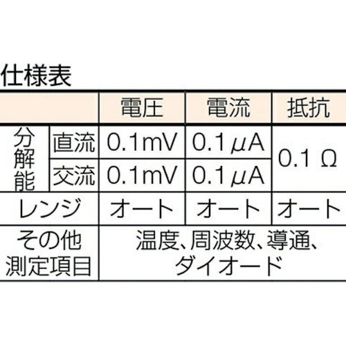 ■直読温度測定可能です。(K型センサー付属)■見やすい大型液晶表示です。■MAXレコーディング機能搭載です。■電圧測定ロスが少ない高入力インピーダンス1000MΩに対応しています。■CE規格品です。■最大表示: 4000カウント■解除可能な約30分で作動するオートパワーオフ機能■電流専用端子への誤挿入警告ブザーを搭載■コンデンサ容量測定(漏れ電流の大きいアルミ電解コンデンサなどは測定不可)■50Hz〜1MHzの周波数測定【用途】・研究開発用。・電子工作用。・ビルメンテナンス用。・施設保存メンテナンス用。【仕様】・直流電圧(V): 1000・交流電圧(V): 1000・直流電流(A): 10・交流電流(A): 10・抵抗(Ω): 40M・検波方式: 平均値整流(MEAN)・導通チェック: 20〜120Ω以下でブザー音 開放電圧: 0.4V未満・電源: 積層型9V乾電池(6F22)×1本(付属)・幅(mm): 87・奥行(mm): 55・高さ(mm): 179・幅×奥行×高さ: 87×55×179mm・連続使用時間: 約150時間・最大表示(カウント): 4000・コンデンサ(F): 3000μ・温度(℃): -20〜300・周波数(Hz): 1M・ダイオードテスト: 開放電圧1.6V未満・検波方式: 平均値整流(MEAN)・高入力インピーダンス1000MΩ・温度測定が可能・1MHzまでの周波数測定が可能・新モデルヒューズの仕様1: 0.63A/500V IR50kA Φ6.3×32mmセラミック管(F1198)・新モデルヒューズの仕様2: 12.5A/500V IR20kA Φ6.3×32mmセラミック管(F1199)・旧モデルヒューズの仕様1: 0.63A/250V IR1.5kA Φ5.2×20mmセラミック管(F2019)・旧モデルヒューズの仕様2: 12.5A/500V IR20kA Φ6.3×32mmセラミック管(F1199)