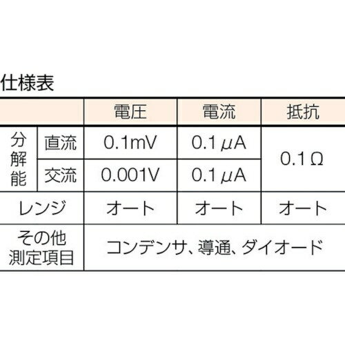 ■別売専用ソフトと光リンクUSBケーブルでパソコンに接続でき、データ取り込みが可能です。■データホールド・レンジホールド付です。■別売のACアダプタを使用して長時間測定可能です。■別売のUSBケーブルとソフトでPCにデータ保存可能です。■CE規格品です。■電流端子4・10A誤挿入防止カバー付です。■最大表示: 4000カウント【用途】・研究開発、パソコンデータ取込用。・電子工作用。・電気工事、設備メンテナンス用。【仕様】・直流電圧(V): 1000・交流電圧(V): 750・直流電流(A): 10・交流電流(A): 10・抵抗(Ω): 40M・検波方式: 平均値整流(MEAN)・導通チェック: 10〜120Ωでブザー音・電源: 単3乾電池(R6P)×2本(付属)・幅(mm): 90・奥行(mm): 48・高さ(mm): 167・幅×奥行×高さ: 90×48×167mm・連続使用時間: 約150時間・最大表示(カウント): 4000・コンデンサ: 100μF・ダイオードテスト(開放電圧約1.5V)・電池寿命150時間・誤挿入防止カバー付き・ヒューズの仕様1: Φ5×20mm 0.5A/250V セラミック管ヒューズ/遮断容量1.5kA・ヒューズの仕様2: Φ6.3×32mm 12.5A/250V ガラス管ヒューズ/遮断容量125A