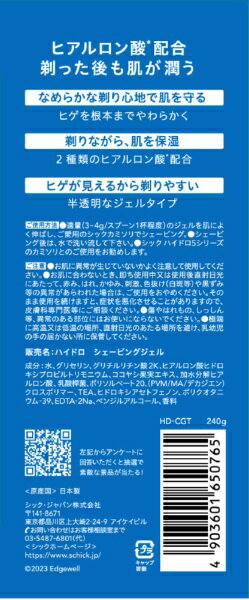 剃る時も肌本来の水分を保ち、しっとりすべすべ肌に。2種類のヒアルロン酸(うるおい成分)配合。独自の処方がヒゲを芯まで柔らかくするので、スムーズにシェービングできます。肌につけた時、ヒゲが見えやすい透明ジェル。シック ハイドロ(カミソリ)とのご使用をお勧めします。【成分】水、ポリソルベート20(メチルビニルエーテル/マレイン酸)クロスポリマー、TEA、ポリクオタニウム-39、グリチルリチン酸2K、セトリモニウムブロミド、EDTA-2Na、安息香酸Na、ヒアルロン酸ヒドロキシプロピルトリモニウム、加水分解ヒアルロン酸、イソプロパノール、メチルパラベン、プロピルパラベン、香料 ----------------------------------------------------------------------------広告文責:株式会社ビックカメラ楽天 050-3146-7081メーカー:シック|Schick商品区分:化粧品----------------------------------------------------------------------------※パッケージリニューアル等で掲載画像とは異なる場合があります※開封後の返品や商品交換はお受けできません
