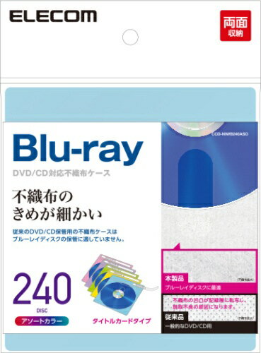 〔不織布ケース〕検索に便利なタイトルカード付き。大量のBlu-ray/CD/DVD Discをコンパクトに収納・整理できる両面収納タイプの不織布ケース。■ 大量のBlu-ray/CD/DVD Discをコンパクトに収納・整理!タイトルカード付不織布ケース大量のBlu-ray/CD/DVD Discをコンパクトに収納・整理できるタイトルカード付き不織布ケースです。■ 薄くて軽い薄くて軽いので、持ち運びやデータの受け渡しにも最適です。■ きめ細かい繊維の不織布を採用表面に凹凸が少なく、きめ細かい繊維の不織布を採用しています。■ 両面収納タイプケース1枚あたりにディスク2枚、またはディスク1枚とジャケットが収納できる両面収納タイプです。■ タイトルカードが付属検索に便利なタイトルカードが付属しています。■ インデックスカード付きタイトルを一覧でまとめて書ける見出し用のインデックスカードがついています。■ ストッパー付きディスクの飛び出しを防止するストッパーが付いています。 エレコム CCD-NIWB240ASO Blu-ray・CD・DVD対応不織布ケース(240枚/アソートカラー) (CCDNIWB240ASO)