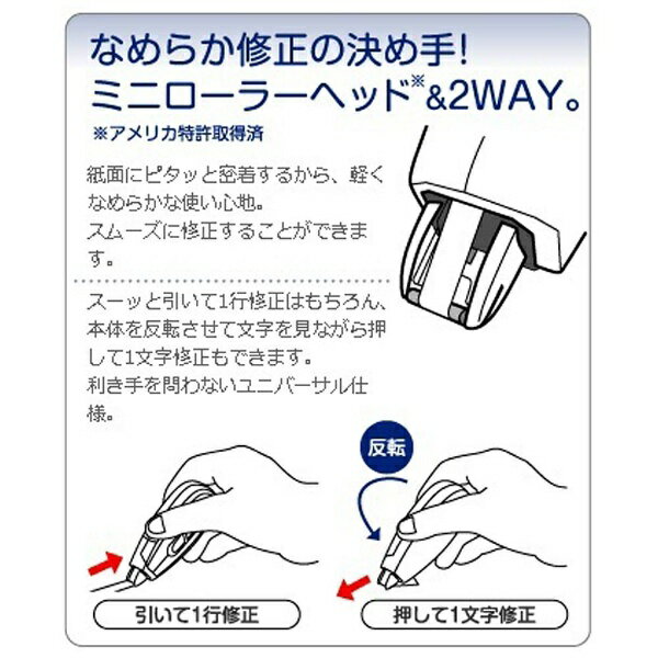 裏から見えない修正テープ3層構造テープ従来の修正テープの白色層の下に、特殊パターンを応用した文字パターンを印刷することで、修正前の文字を裏面から透かした際も読みにくい!いつもピンとはったテープできれいに修正スライドさせてヘッドを出すと、いつでもテープが張っている状態になるから、きれいに修正することができます。【仕様】■本体サイズ:W89.8×D38.6×H22.5mm■材質:97%再生樹脂(本体ケース=100%再生ポリスチレン(PS))