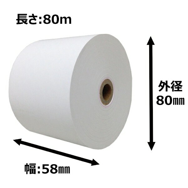 幅58mm、外径80mm(長さ約80m)タイプのサーマルプリンター用ロールペーパー【ペーパー仕様】・紙種:中保存タイプ・ロール幅:58mm・外径:80mm・長さ:約80m・紙厚:約65μm・芯:内径12mm、外径18mm■感熱(サーマル)タイプのロールペーパー レジのレシートや整理券などにご利用いただけます。■1巻が長くてお得 紙厚が約65μmで薄いため1巻の長さが比較的長いです。※使用する機器の対応可能なロールペーパーのサイズを確認してご購入ください。(使用可能のAirレジ対応プリンター)・RP-F10シリーズ(セイコーインスツル)・RP-D10シリーズ(セイコーインスツル)・mC-Print3シリーズ(スター精密)(参考)年間使用量の目安 本製品のレジロールを使用した場合、一般的な小売店で年間18個必要です。※仮定条件 1日あたりの会計回数:20回 1回のレシートの長さ:20cm※計算式 0.20m×20回/日×30日/月×12月/年=1440m/年 1440m÷80m/個=18個 【ビックカメラグループオリジナル】※本商品が対象となるクーポンは、その期間終了後、同一内容でのクーポンが継続発行される場合がございます。