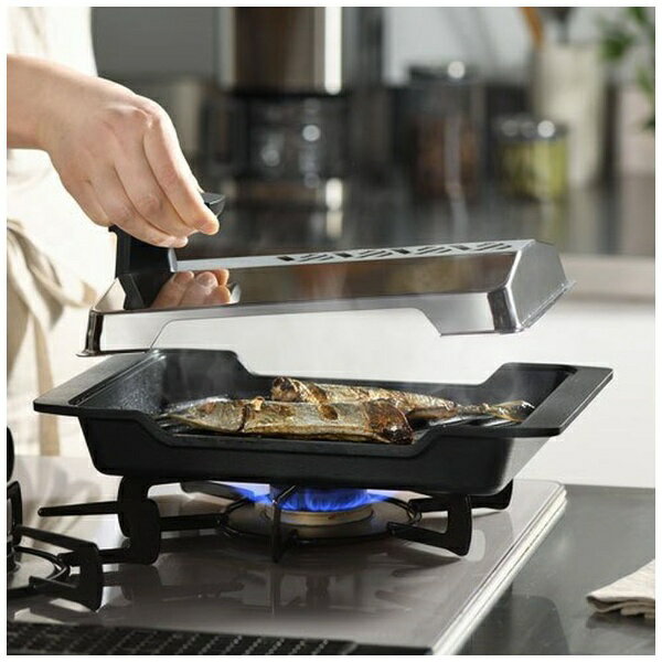 ■七輪で焼いたように焼き上げる新タイプの魚焼き器 炭プレートの遠赤効果と独自形状の蓋との組み合わせで中はふっくら、表面は皮パリに。炭火で焼いた焼魚の感動を自宅で楽しめます。■炭プレートは極厚で優れた遠赤効果を発揮 炭プレートの遠赤効果はアルミの約14倍。炭プレートはアルミの約14倍もの強力な遠赤外線を発生します。ほぼ伝導熱のみの一般的なフライパンとは加熱の性質そのものが異なります。■遠赤効果プラス空気を取り込み身はふっくら、表面は皮パリに 左右に設けた通気口から空気を取り込み、蓋上部の穴から程よく蒸気を逃がします。炭プレートから発生した遠赤外線を皮パリ蓋裏面のステンレスの鏡面が反射し、食材全体に効率よく熱を伝えます。