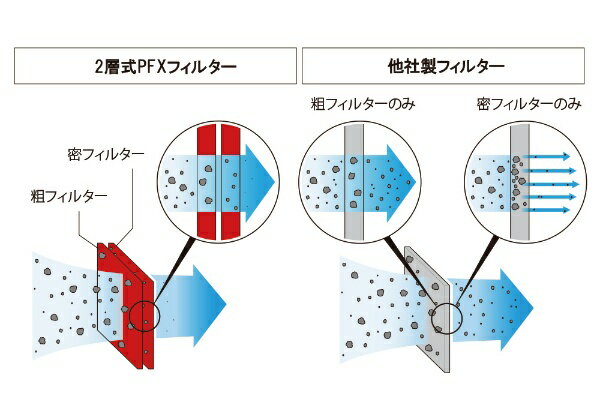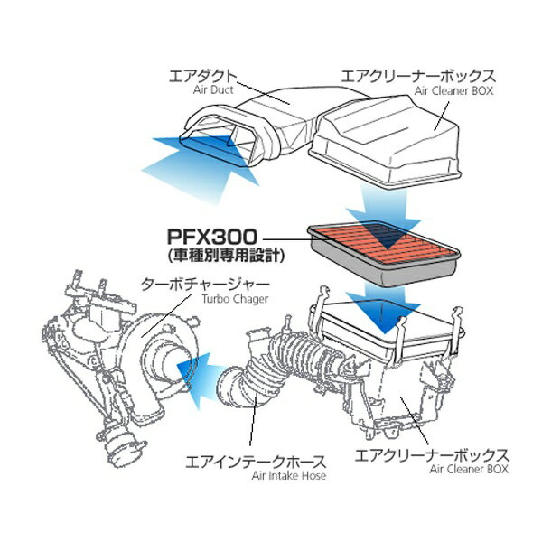 PFX300は、高い集じん効率と低い吸気抵抗を両立した、車種専用設計のトレードインタイプフィルターです。取付は純正エアフィルターと交換するだけ。ユーザー様でも簡単に装着頂けます。オープンタイプのエアクリーナーがレギュレーション(車両規則)で制限されている、モータースポーツで使用できます。【フィルターの目的】 抜群の集塵能力でエンジンとターボを守ること。■新開発フィルターろ材 210NR は、抜群の集塵性能によって、エンジンやターボに有害な 砂・粉塵・鉄粉 を漏らさずに捉えます。■10μmクラスのNo.1フィルター、1μmクラスの No.2フィルターの 2層 2段階集塵によって、清浄効率 98%を実現しました。他社スポーツフィルターの様に砂を吸い込むことはありません。【もっと遠くへ、より長く、そしていつまでもスポーツを楽しみたい。】■性能維持の為、5000kmでの点検・清掃、10000kmでの交換を推奨します。 フィルターの汚れがひどい場合や破損がある場合は10000kmに達していなくても商品の交換が必要です。※フィルターの水洗い等はできません。サイズ:244×205.5×35ろ材面積:2250cm2適合メーカー:スズキ純正部品No.:13780-77R00車名/型式 ジムニー/ JB64W
