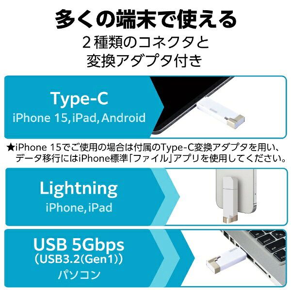 【エントリーで最大全額ポイント還元|11/27迄】 ELECOM|エレコム USBメモリ MFi認証(Android/iOS/Mac/Windows11対応) ホワイト MF-LGU3B256GWH [256GB /USB TypeA+USB TypeC+Lightning /USB3.2 /キャップ式]