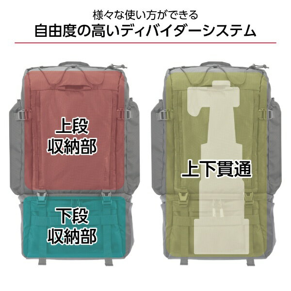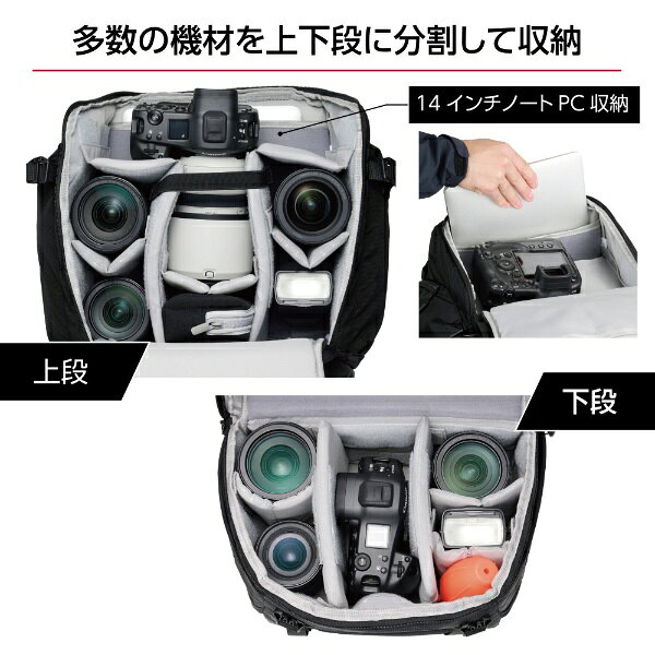 一眼カメラや多数の交換レンズなどの機材を上下の収納部に分けて収納できる大容量2気室設計のバックパック。上下の仕切りを取り外し、レンズを下段に貫通させることで100-300mm F2.8などの超望遠レンズを装着した一眼カメラの収納も可能です。大容量ながら軽量設計で、バンジーコードやデイジーチェーンなど、トレッキング向けの装備も充実しています。 【rb_remp】