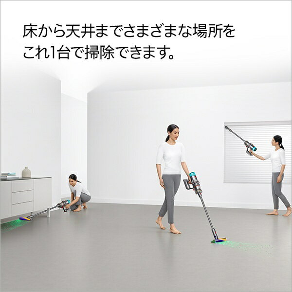 繊細なホコリを可視化。光らせて、見逃さない掃除機。■Fluffy Opticクリーナーヘッド 正確な角度の光で床の表面のホコリを照らし、目に見えない微細なホコリの輪郭で 床から浮かび上がらせて、見逃しを防ぎます。(*1)■精密な設計独自開発のレンズで、光を床上7.3mmから1.5度の下向き角度で扇形に広げ、微細なホコリを照らして床面から浮き立たせます。(*1)■グリーンLED人間の目は、緑色の光への感度が高くなっています。緑色は他の色よりも明るく感じられるためコントラストが高まり、見えにくいホコリがはっきり見えるようになります。(*1)■計測吸気口に設置されたピエゾセンサーが、ゴミの量とサイズを常に計測します。(*2)※画像は実際の製品カラーと異なります。■反応ゴミの量が多いと検知した場合、Dyson Hyperdymiumモーターの吸引力を高めます。(*2)■浄化された空気を排出製品全体で5段階にわたりゴミを捕集し、HEPAフィルターでウイルスを含む0.1ミクロンもの微細な粒子を99.99%捕らえます。 (*3)※画像は実際の製品カラーと異なります。■最長60分の運転時間安定したパワー供給により、最長60分間(*4)パワフルで変わらない吸引力を実現。■掃除の結果を数値で証明吸引したゴミを計測、サイズごとに分類し、その結果を液晶ディスプレイにリアルタイムに表示します(*2)。また、現在の吸引モードや秒単位の残りの運転時間を表示し、効率的な掃除を可能にします。■ボタン式スイッチ電源ボタンを押すだけで、快適に掃除を継続できます。障害物の周りを掃除する際にも、簡単に手を持ち替えて掃除できます。■床から天井までさまざまな場所をこれ1台で掃除できますダイソンのコードレスクリーナーは、通常は掃除する場所に合わせて複数のクリーナーが必要となるところを、1台で掃除できます。 付属ツールを付け替えて布団クリーナーとして、布団やベッドからハウスダストをしっかり除去。さらにハンディクリーナーとして手の届きにくい場所や、車の中の掃除にも使用できます。■毛絡み防止スクリューツール髪の毛やペットの毛絡みを防止。すばやく毛を巻き取って吸い取ります。■隙間ノズル狭い隙間や届きにくい場所のお掃除に便利です。■コンビネーションノズル 先端にブラシがあり、用途によってブラシを出したりひっこめたりして使用できます。■壁掛け式の収納用ブラケット壁掛け式の収納用ブラケットに掛けておけば、次の掃除のときにすぐに使えます。■水洗いも可能クリアビンやフィルター、ブラシバーは簡単に取り外せて、水洗いが可能です。(*5)■簡単に交換できるバッテリーボタンひとつでバッテリーを取り外せるので、交換に手間がかかりません。予備の着脱式バッテリー(別売)と交互に使用することで、より長時間の掃除にも対応できます。着脱式バッテリーは単体でも充電可能です。※画像は実際の製品カラーと異なります。■衛生的で簡単なゴミ捨てまっすぐでスリムなクリアビンは、スムーズに開閉する構造で、ゴミやホコリに触れずに、衛生的にゴミ捨てが可能です。