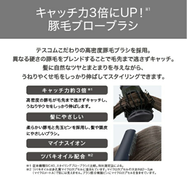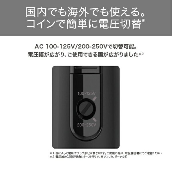 AC 100-125V/200-250Vで切替可能。電圧幅が広がり、ご使用できる国が広がりました。※ ※電圧域AC250V地域:オーストラリア、南アフリカ、ガーナなど 異なる硬さの天然毛をブレンドした高密度豚毛ブラシです。高密度で髪をしっかりキャッチしてブローできるため、髪に自然なツヤとまとまりを与えながら、うねりやくせ毛をしっかり伸ばして美しい仕上がりへと導きます。さらに、適度な硬さの豚毛が、頭皮にマッサージ効果をもたらします。 ブラシのサイドに配したキャッチコームが毛先まで逃さず、まとまりのある仕上がりへとサポートします。ブラシの先端はスリムで髪の間に入りやすく、使いやすさを考慮しました。髪や頭皮に優しい先玉を採用し、髪あたりはやわらかです。ブラシ部分樹脂ピンには、ツバキオイルを配合したマイクロカプセル※を含ませています。 ※ツバキオイルは多孔質マイクロカプセルに含まれています。 ブラッシングしながらマイナスイオン※が髪全体に行き届き、髪の広がりの一因となる静電気を低減します。 ※放出イオン量 約1,000万個/cm3以上 / 当社測定法/当社比較検証法による DRY/SET/COOLの段階からお好みの風を選べます。仕上げのCOOLでスタイルが長持ちします。 使い方や利き手に合わせて、前後左右の4方向にブラシの方向を変えることができます。 ブラシは取り外してまるごと水洗いが可能です。いつでも清潔に使えます。 Aタイプ・Cタイプ対応の国であれば、別途プラグを用意する必要がないのですぐに使えます。 レバーを押すだけで簡単にプラグを抜くことができます。力の弱い方やお年寄り、爪の長い方やネイルをしている方でも、プラグを楽にコンセントから抜くことができます。 電源コードが本体取り付け部で360度回転します。コード自体もねじれにくいので使いやすく快適です。