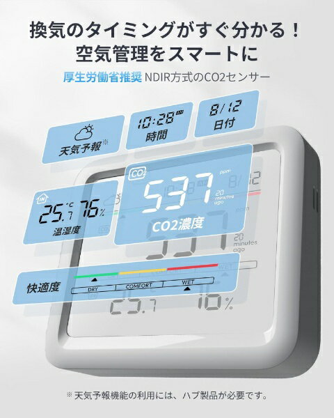 【6-in-1多機能室内空気環境モニター】 見やすいサイズのスクリーンでCO2 濃度、室内の温度、湿度、時刻、日付、快適度が一目でわかります。 周囲の空気環境をリアルタイムで測定し、過密状況を把握して換気するタイミングを逃しません。 家庭、事務所、車内はもとより、病院や介護施設、学校、展示場、ジム、ホテルなど多くの人が集まる場所で幅広く使用できます。 【天気状況もスクリーンで表示可能】 Switchbotハブと組み合わせることで現地の12時間以内の天気予報を表示可能 【アプリでアラート設定が可能】 三つの通知方法でアラートメッセージの見逃しを防止できます。 本体音声アラート通知: CO2濃度・温度・湿度が設定範囲を超えたら、CO2センサー(温湿度計)本体は警報音を鳴らして注意させます。 本体のボタンを押すことで、警報音を停止できます。 本体スクリーン点滅通知: CO2濃度・温度・湿度が設定範囲を超える場合、警報音だけでなくスクリーンも点滅状態になり、より直感的にわかりやすくなります。 アプリ通知: ハブと併用することで、CO2濃度・温度・湿度が設定範囲を超えたらスマホアプリへ通知。 外出先でも室内の空調環境を把握することが可能です。 CO2測定範囲:400-9999ppm 温度測定範囲: -20〜80℃ 相対湿度測定範囲: 0-99% 色:ホワイト 材質:ABS 電源:単3電池×2、5V/1A電源アダプター 電池寿命:約6か月