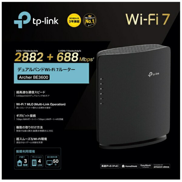 【エントリーで最大全額ポイント還元|11/27迄】 TP-Link|ティーピーリンク Wi-Fiルーター 2882+688Mbps Archer BE3600 [Wi-Fi 7(be) /IPv6対応]【newlife_campaign_h】