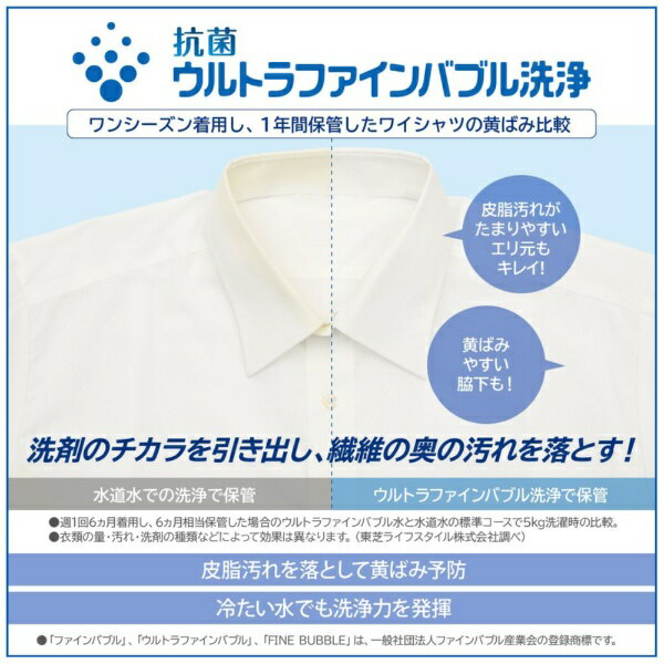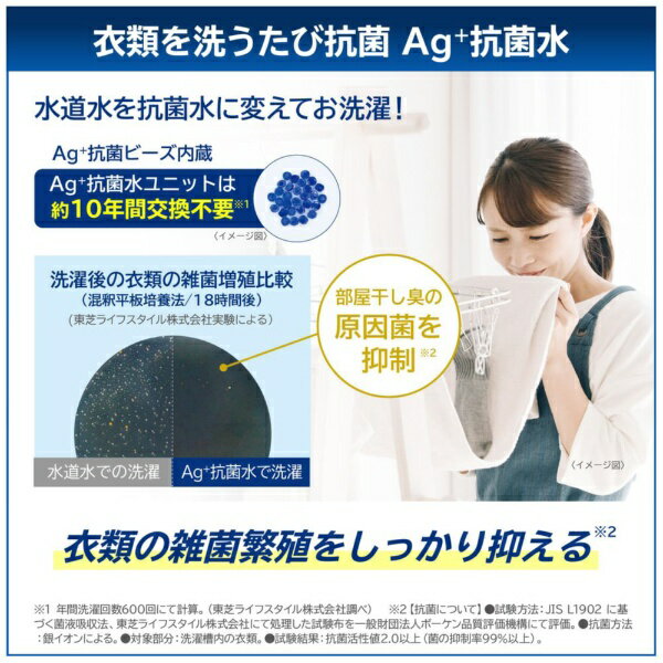 ■抗菌ウルトラファインバブル洗浄繊維の奥から汚れを落として、黄ばみを防ぐ!さらに、洗うたびに抗菌!(※1)部屋干し臭の原因菌も抑える。(※1)■ウルトラファインバブルすすぎすすぎの回数や水量を増やさずに、 しっかりすすげる。■液体洗剤・柔軟剤 自動投入適量の洗剤を計量して自動で投入するので便利。さらに、自動投入ならではの自動2度洗いコースも搭載。■低振動・低騒音設計(*)深夜や早朝のお洗濯も気がねなく。*洗い約29dB 脱水約37dB■(NEW)しわ抑え脱水コース(洗濯容量3kgまで)通常の脱水よりも低速で、やさしく脱水します。脱水しわや型くずれを抑えることができます。■ほぐせる脱水脱水の最後にパルセーターを細かく動かし、洗濯槽に付いた衣類をはがしてほぐすので取り出しやすい。■槽洗浄めやすサイン忘れがちな槽洗浄のタイミングのめやすを自動でお知らせ■自動お掃除モード自動お掃除で槽を除菌(※2)、黒カビの発生を抑えます(※2)。※1 抗菌について●試験方法:JIS L1902に基づく菌液吸収法、当社にて処理した試験布を一般財団法人ボーケン品質評価機構にて評価 ●抗菌方法:銀イオンによる ●対象部分:洗濯槽内の衣類 ●試験結果:抗菌活性値2.0以上(菌の抑制率99%以上)※2 除菌、カビの抑制について●試験依頼先:一般財団法人日本食品分析センター●試験方法:洗濯槽・水槽に有機物と共に付着させた菌、カビの減少率測定。●除菌、 カビ抑制方法:「自動お掃除」モードでの洗濯槽・水槽の洗浄による。●対象部分:洗濯槽・水槽。●試験結果:菌、カビの減少率99%以上。室温・水温、水道水圧、設置・排水条件、衣類の量や種類、衣類の片寄り、風呂水の使用などにより、使用水量・消費電力量・運転時間が増減します。 【wash_Re】