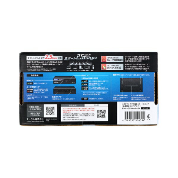 全ポート2.5Gbps対応の5ポートスイッチングハブ。高速インターネット回線と組み合わせることで、2.5Gbpsの通信環境を構築でき、オンラインゲームや動画ストリーミングなどの大容量サービスも快適に楽しめます。 ※理論上の最大値であり、実際の転送速度を示すものではございません。また2.5Gbpsで通信するには、接続するLANケーブルと機器がともに2.5GBASE-Tに対応している必要があります。 ファンレス設計のため動作音がありません。静音性を重視する家庭やオフィスでの使用におすすめです。 片手で持てる小型モデルのため、わずかなスペースで設置できます。 ループ検知機能を搭載しています。LEDランプの点滅によりネットワークループ発生をお知らせし、ネットワーク障害の解消を促します。 メイン基板に高分子アルミ固体電解コンデンサーを使用しています。それにより長寿命設計を実現した信頼性の高いスイッチングハブです。 ACアダプターに耐トラッキング性のコンセントプラグを採用。長期間設置した場合でも、トラッキング現象を防止します。 らくらく節電E機能対応。IEEE 802.3az(EEE規格)に対応しているスイッチや端末との組み合わせで手間なく自動的に省エネを実現します。パソコンがシャットダウンしている環境では、大幅な電力の節約を実現することができます。 らくらく節電E機能で最大約74%節電。[計測方法]:負荷機から本製品にデータを転送。全ポート通信時と非通信時の1分後の電力を比較 別売のハブ用オプションマグネット(EHB-EX-MG4)を取り付けることで、金属面への設置も可能になります。 環境にやさしいEU RoHS指令準拠。EU RoHS指令とは電気・電子機器に関する特定有害物質の使用制限についてEU(欧州連合)が決めた指令です。 自社環境認定基準を1つ以上満たし、『THINK ECOLOGY』マークを表示した製品です。 環境保全に取り組み、製品の包装容器が紙・ダンボール・ポリ袋のみで構成されている製品です。