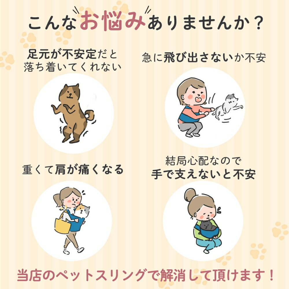 【商品仕様】犬 猫 ペット用スリング。飼い主にもペットにも快適に過ごしてほしいと改良されたペットスリングです。厚手の生地を使用し保温性がありつつ、カバー部分はメッシュ素材で通気性も良く快適に過ごせます。秋冬春に活躍します。耐荷重は8キログラムとし、肩への負担なども考慮し推奨は6キログラム以下としています。 【強度UP底板】ペットに負担のかからない姿勢で過ごしてもらうため底板を改良し、強度UP、ワイドサイズに仕上げました。強度のある底板によりキャリーバッグのような感覚でご使用いただけます。 【肉厚肩パッド】肉厚の肩パッドを準備し、ショルダー部への負担も軽減されました。抱っこ紐を使用した時の肩に食い込むあの痛みはもうありません。 【長さ調整可能ベルト】ご使用者様の身長や体格に合わせ長さ調整ができるベルトを準備しています。 【多機能スリング】お出かけに重要なペットの飛び出し防止機能を2重にし安心、小物が入るポケットを2つに増やし、よりお出かけしやすくなりました。 【しっかりサポート】日本国内にて検品を行い商品には万全を期しておりますが不備や故障、お問合せなどありましたら誠心誠意対応させて頂きます。日本企業、日本人スタッフとなりますのでお気軽にお問合せ下さい。【商品仕様】犬 猫 ペット用スリング。飼い主にもペットにも快適に過ごしてほしいと改良されたペットスリングです。厚手の生地を使用し保温性がありつつ、カバー部分はメッシュ素材で通気性も良く快適に過ごせます。耐荷重は8キログラムとし、肩への負担なども考慮し推奨は6キログラム以下としています。 【強度UP底板】ペットに負担のかからない姿勢で過ごしてもらうため底板を改良し、強度UP、ワイドサイズに仕上げました。強度のある底板によりキャリーバッグのような感覚でご使用いただけます。 【肉厚肩パッド】肉厚の肩パッドを準備し、ショルダー部への負担も軽減されました。抱っこ紐を使用した時の肩に食い込むあの痛みはもうありません。 【長さ調整可能ベルト】ご使用者様の身長や体格に合わせ長さ調整ができるベルトを準備しています。 【多機能スリング】お出かけに重要なペットの飛び出し防止機能を2重にし安心、小物が入るポケットを2つに増やし、よりお出かけしやすくなりました。 【しっかりサポート】日本国内にて検品を行い商品には万全を期しておりますが不備や故障、お問合せなどありましたら誠心誠意対応させて頂きます。日本企業、日本人スタッフとなりますのでお気軽にお問合せ下さい。