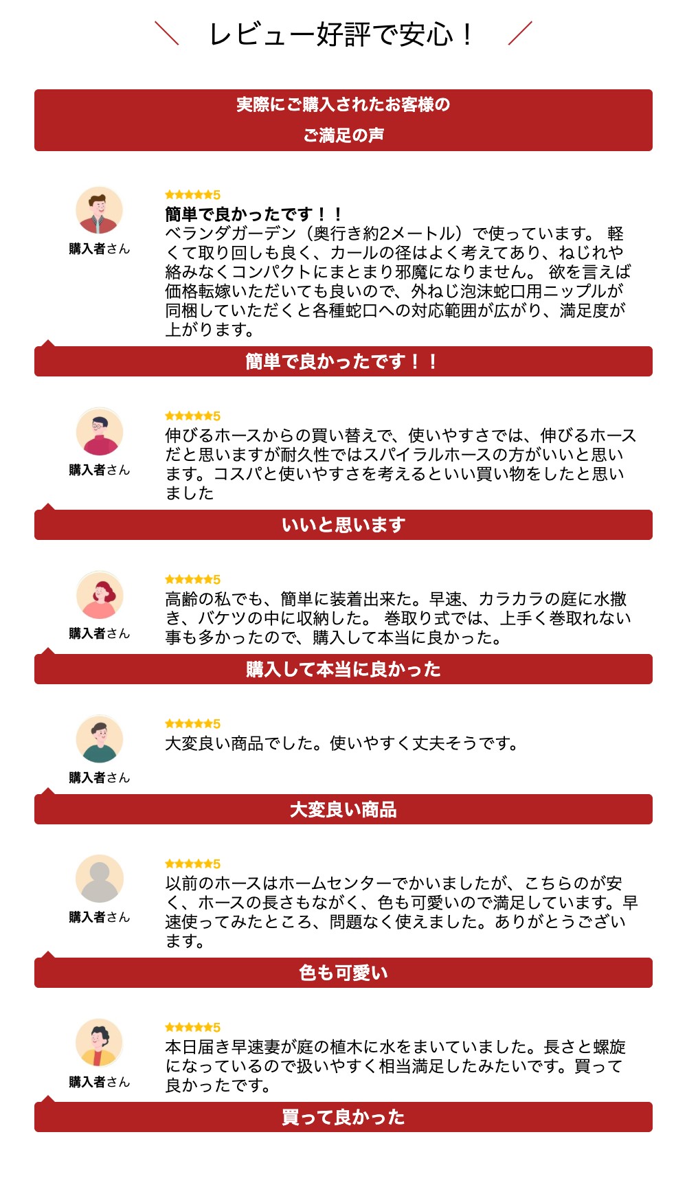 【巻き取り不要で楽々!4種類の噴射モードで様々な用途に対応!】 ・スーパースパイラルホース もうホースの巻き取りにイライラしない! 今すぐ「巻き取り不要のすっごいホース」を手に入れて、快適な水やり&お掃除ライフを始めませんか? 庭の水やりから洗車、玄関掃除まで、これ一本でOKの万能スパイラルホースが登場! 使用後は自然に縮むので、面倒な巻き取りは一切不要。 コンパクトに収納でき、保管場所にも困りません。 選べる4種類の噴射パターンで、用途に合わせて自由自在! ・付属のノズルを回すだけで、簡単に噴射パターンを切り替え可能。 シャワー: デリケートな植物への水やりや、広範囲への散水に最適。 ストレート(高水圧水流): 洗車や頑固な汚れの洗い落としに威力を発揮! フラットスプレー(平面状): 窓ガラスや壁面など、広い面を効率的に洗浄。 フルアクション(放水): 大量の水を勢いよく出したい時に。 ・様々なシーンで大活躍! ガーデニング: 庭木や花壇の水やり、芝生の散水に。 洗車: 愛車のボディやタイヤの洗浄に。 お掃除: 玄関アプローチ、ベランダ、窓ガラス、外壁などの清掃に。 その他: アウトドア後の道具の洗浄などにも便利。 ・製品仕様 噴射パターン: シャワー、ストレート(高水圧水流)、フラットスプレー(平面状)、フルアクション(放水) サイズ(使用時 最大): 約15m ・材質: ホース:EVA ノズル:ABS樹脂 蛇口アタッチメント:ABS樹脂、PP パッキン:天然ゴム 取り付け: ワンタッチ式で簡単接続 注意事項 モニターの発色具合によって実際のものと色が異なる場合がございます。 掲載画像はイメージであり、実際の製品とは多少異なる場合があります。 製品の仕様は品質の向上・改善のため、予告なく変更となる場合があります。 メーカー希望小売価格はメーカーカタログに基づいて掲載しています関連商品散水ホース ノズル セット コンパクト ホースリール 10m ブラック...高圧洗浄 クリーン ノズル 高水圧 強力洗浄 洗車 清掃 水まき 水や...高水圧 パワフル ノズル 強力洗浄 洗車 清掃 水まき 水やり 打ち水...1,840円1,980円1,780円散水 ホース ステンレスコイルホース 10m ウォーターガン付き ガ...棚 収納ラック シンプル ハンガーラック 3段 幅52×奥行き36×高...サンシェード 車 傘型 曲がる フロント 遮光 遮熱 日よけ 折りたた...4,980円1,900円1,690円多目的ノコギリ 折りたたみマルチのこぎり 刃渡り 約21cm セーフテ...サンシェード 車 傘 曲がる パラソル 型 フレキシブル Sサイズ M...折りたたみテーブル ガジェット 60×40cm コンパクト タブレット...1,780円1,780円1,780円【3箱セット】マスク 冷感マスク 不織布 立体 3D マスク KN95...クッション ファイバー 折りたたみ カバー付き 丸洗いOK 長座布団 ...ステンレス アイスパック 保冷剤 長時間 長持ち コンパクト 繰り返し...1,780円1,780円1,780円