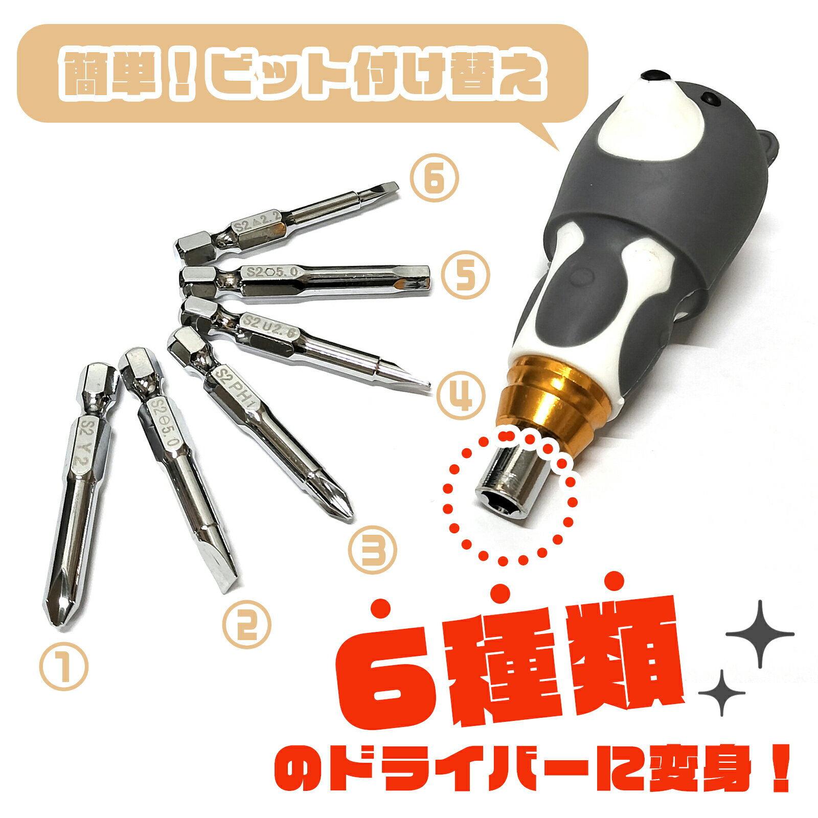 \かわいいけど利便性抜群の工具アイテム!/ 個性的だけど便利なドライバーセットを探している。 ギフトに少し変わった物をプレゼントしたい。 使わない時はコンパクトに収納したい。 そんな商品をお求めのお客様におすすめです! ビットを付け替えて6通りのドライバーに! バラつきやすいビットを便利に収納できる構造。 使わない時は置いておくだけでも可愛らしいインテリアになる♪ 以下の仕様でお使い頂けます。 ■プラスドライバー ■マイナスドライバー ■六角ドライバー ■U型ドライバー(ジャックドライバー) ■Y型ドライバー ■三角ドライバー(特殊ドライバー) □SIZE□ (約)12.5cm×4.5cm 重量 (約)179g
