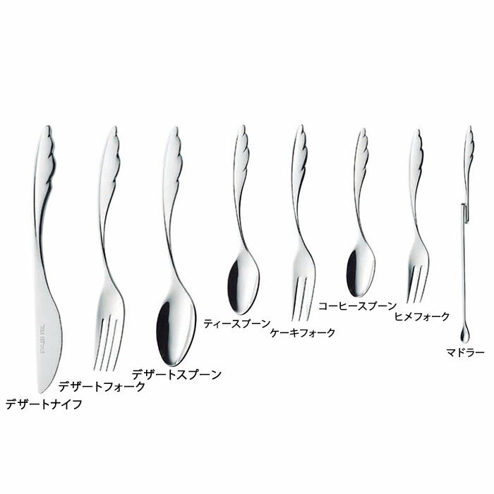 商品名ボヌール カトラリー 商品説明フランス語で「幸せ」を意味する羽モチーフのカトラリー。 表面仕上げはミラー、シンプルで時代に左右されないフォルム。 サイズ・デザートナイフ190mm ・デザートフォーク175mm ・デザートスプーン170mm ・ティースプーン135mm ・ケーキフォーク140mm ・コーヒースプーン120mm ・ヒメフォーク125mm ・マドラー160mm 種類デザートナイフ、デザートフォーク、デザートスプーン、 ティースプーン、ケーキフォーク、コーヒースプーン、 ヒメフォーク、マドラー お選びください。 材質18-8ステンレス デザートナイフのみステンレス 原産国中国 メーカー高桑金属