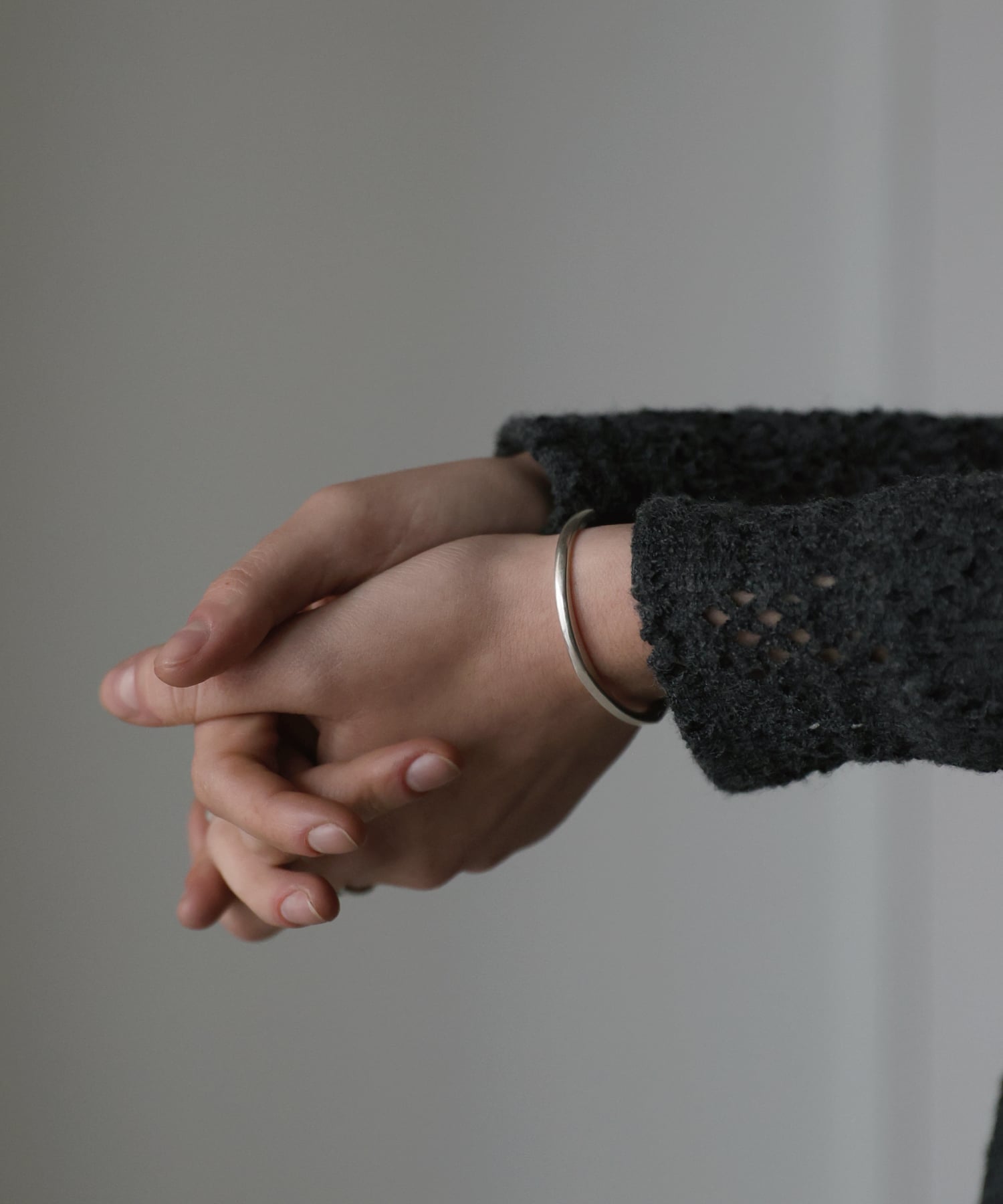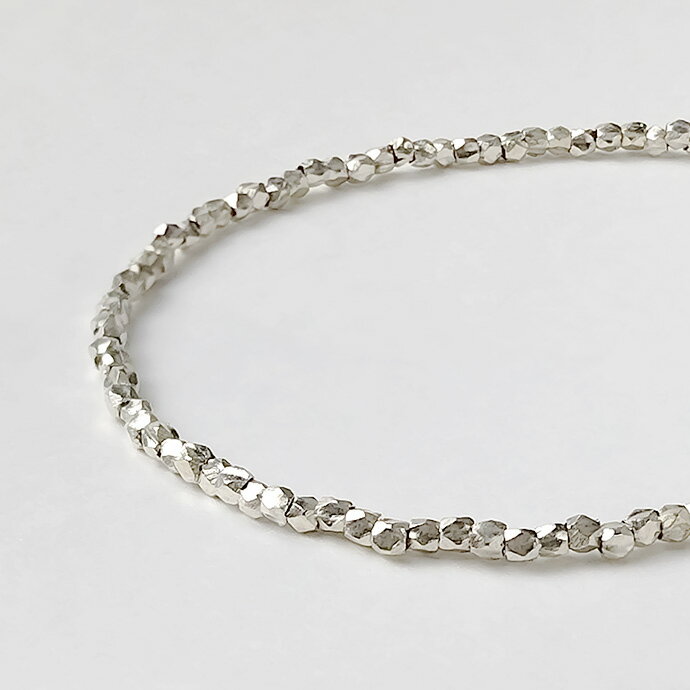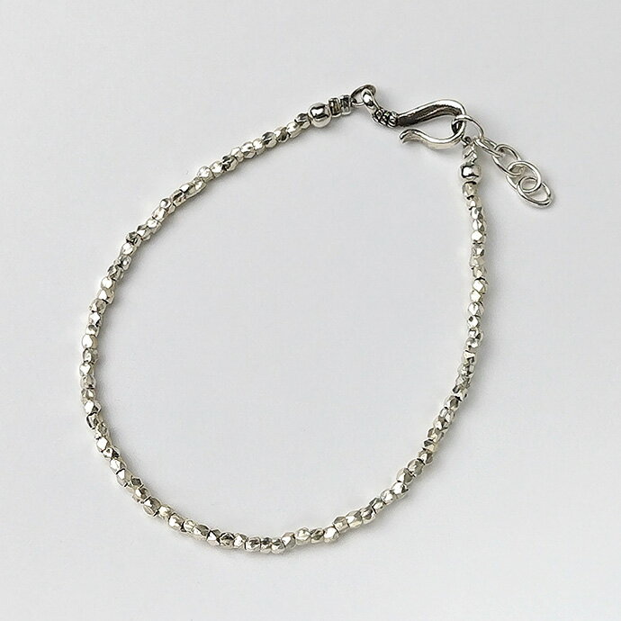 KAREN SILVER BEADS BRACELETカレンシルバービーズブレスレット ランダムカットによる輝きが印象的なカジュアルコーデに合うブレスレットです。 カレンシルバー製ビーズを使用カレンシルバーは銀純度95%以上のシルバーで、タイの山岳民族・カレン族が伝統的手法で製作しています。 輝きとマット感が共存するビーズマットでざらりとしたテクスチャーで、手作りならではの味のあるビーズです。 デザインの高いねじれ形状フック小ぶりで悪目立ちせず全体の印象を損ねません。アジャスターで長さ調節が可能です。 重ね付けもしやすいシンプルデザインさらりと着けただけで一気にこなれ感が出る、カジュアルコーデにオススメのアイテムです。 商品詳細 説明ランダムなカットによるキラキラとした輝きが印象的な、カレンシルバー製ビーズブレスレットです。カレンシルバーはタイの山岳民族・カレン族が伝統的な手法で1つ1つ手作業で作り出した、銀純度95%以上のシルバーアクセサリーを指します。細めでシンプルながらその輝きで手首のアクセントにもなってくれる、カジュアル・アメカジコーデにオススメのアイテムです。 素材ビーズ:カレンシルバー(シルバー950以上・950の刻印は入っておりません)フック・アジャスター:シルバー925 サイズメンズサイズ:全長:約19cm(内アジャスター約2cm)、内周:約17〜18.5cm レディースサイズ:全長:約17.5cm(内アジャスター約2cm)、内周:約約15〜16.5cm 共通:幅約2mm、重量約2.5g 注意点※クリップの湾曲には個体差がございます ≫カレンシルバー特集はコチラ