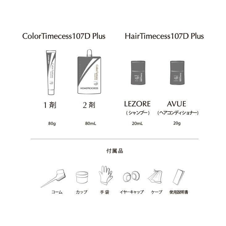 ホームプログレスカラーガイド ホームプログレスを安全にお使いいただくために 使用上のご注意をよく読んで、正しくお使いください。 ヘアカラーでかぶれたことのある方は、絶対に使用しないでください。 ご使用前には毎回必ず皮膚アレルギー試験(パッチテスト)をしてください。パッチテストの方法は、(日本ヘアカラー工業会ページ)をご確認ください。 使い方 染毛の2日前(48時間前)には、毎回必ず皮膚アレルギー試験(パッチテスト)を行ってください。 混合クリームを作り髪に塗ります 美しいカラーリングのためにたっぷりと塗布します。(20~30分放置) 洗い流します カラーのクリームをしっかりと洗い流した後、付属のレゾーレ(シャンプー)・アビュー(ヘアコンディショナー)で仕上げます。 しっかりと髪を乾かします 髪を乾かす時はレプロナイザーのご使用を推奨します。ストレート・カールをする時はヘアビューロンのご使用を推奨します。 注意事項 ヘアカラーでかぶれたことのある方は絶対に使用しないでください。 ヘアカラーはアレルギー反応をおこすことがあります。 皮膚アレルギー試験(パッチテスト)を毎回必ず行ってください。 ご購入前・ご使用前にお読みください ご使用の際は使用説明書をよく読んで正しくお使いください。 次の方は使用しないでください。 今までに本品に限らずヘアカラーでかぶれたことのある方 今までに染毛中または直後に気分の悪くなったことのある方 皮膚アレルギー試験(パッチテスト)の結果、皮膚に異常を感じた方 頭皮あるいは皮膚が過敏な状態になっている方(病中、病後の回復期、生理時、妊娠中等) 頭、顔、首筋にはれもの、傷、皮膚病がある方 腎臓病、血液疾患等の既往症がある方 体調不良の症状が持続する方(微熱、倦怠感、動悸、息切れ、紫斑、出血しやすい、月経等の出血が止まりにくい等) 薬液や洗髪時の洗い液が目に入らないようにしてください。 眉毛、まつ毛には使用しないでください。 幼小児の手の届かないところに保管してください。 高温や直射日光を避けて保管してください。 幼小児には使用しないでください。 認知症の方などの誤食等を防ぐため、置き場所にご注意ください。 お肌に異常が生じていないかよく注意して使用してください。お肌に合わない時は、ご使用を止めてください。 セット詳細 カラータイムセス 107D Plus 1剤(医薬部外品)80g カラータイムセス 107D Plus 2剤(医薬部外品)80mL ヘアタイムセス 107D Plus レゾーレ(シャンプー)20mL ヘアタイムセス 107D Plus アビュー(ヘアコンディショナー)20g その他付属品:混合用カップ / コーム / 手袋 / ケープ / イヤーキャップ / 使用説明書 製品名 カラータイムセス 107D Plus ホームプログレス全4色 [医薬部外品] 内容量 内容量:80g+80mL 広告文責 株式会社リュミエリーナ TEL 0120-710-971 メーカー 株式会社リュミエリーナ ブランド バイオプログラミング 商品区分 日本製/ヘアケア 成分 【 1剤 】販売名:カラータイムセスーLS6 (有効成分)レゾルシン, パラアミノフェノール, メタアミノフェノール, 塩酸2,4-ジアミノフェノキシエタノール, パラフェニレンジアミン(その他成分)セトステアリルアルコール, 硬化油, パーム核油, パーム油, パルミチン酸2-エチルヘキシル, ポリオキシエチレンセチルエーテル, ポリオキシエチレンベヘニルエーテル, ステアリルアルコール, ポリエチレングリコール1500, 塩化ステアリルトリメチルアンモニウム, ラウリン酸アミドプロピルベタイン液, 亜硫酸ナトリウム(無水), L-システイン塩酸塩, L-アスコルビン酸ナトリウム, エデト酸塩, アミノエチルアミノプロピルメチルシロキサン・ジメチルシロキサン共重合体, チンピエキス, タイソウエキス, モモ葉エキス, ショウキョウエキス, オウレンエキス, ウイキョウエキス, シャクヤクエキス, ニンジンエキス, サンショウエキス, ヤグルマギクエキス, ヨモギエキス, トウヒエキス, ジオウエキス, ヨクイニンエキス, トウキエキス(1), クチナシエキス, オウバクエキス, トウニンエキス, 1,3-ブチレングリコール, エタノール, 無水エタノール, イソプロパノール, pH調整剤, 精製水 販売名:カラータイムセスーMR8 (有効成分)レゾルシン, パラアミノフェノール, メタアミノフェノール, パラフェニレンジアミン, 5-アミノオルトクレゾール(その他成分)セトステアリルアルコール, 硬化油, パーム核油, パーム油, パルミチン酸2-エチルヘキシル, ポリオキシエチレンセチルエーテル, ポリオキシエチレンベヘニルエーテル, ステアリルアルコール, ポリエチレングリコール1500, 塩化ステアリルトリメチルアンモニウム, ラウリン酸アミドプロピルベタイン液, 亜硫酸ナトリウム(無水), L-システイン塩酸塩, L-アスコルビン酸ナトリウム, エデト酸塩, アミノエチルアミノプロピルメチルシロキサン・ジメチルシロキサン共重合体, チンピエキス, タイソウエキス, モモ葉エキス, ショウキョウエキス, オウレンエキス, ウイキョウエキス, シャクヤクエキス, ニンジンエキ