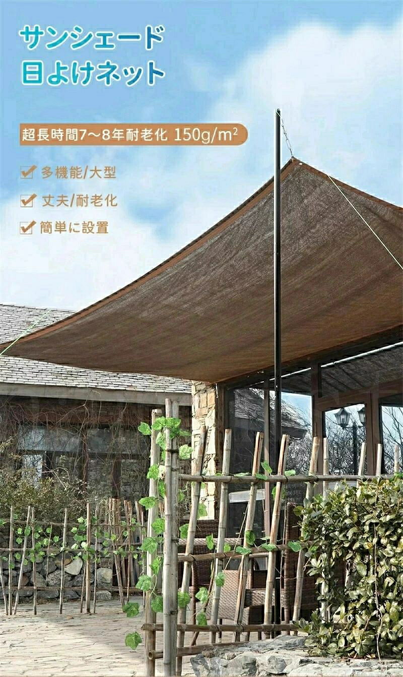サイズ:500×200cm(ネットに記載されているサイズは大体のサイズですが、実物は仕立てによって誤差がありますのでご了承ください)素材:高密度ポリエチレン(PE+UV)色:コーヒー色(写真図示)1平方メートルにつきの重さ約130g付属品:取り付け紐 10m×1本(実際によってせん断可/注文する内容によってロープの数も増える/ロープの数は必要があれば店長に問い合わせください)紫外線 UVカット率?遮光率?約95%UVカット&紫外線防止この目隠しシェードはHDPE素材を採用して耐久性や通気性が優れ、断熱効果や遮光性能を兼ね備え直射日光を遮り、紫外線を約95%カットしてくれます。冷房効率も上がります。透けない生地なので外からの目隠し効果もあります。風通しが良いただ紫外線をカットするだけでなく風通しにもこだわっています。風通しを良くすることで、熱気を逃し風の涼しさを実感できます。エアコン代の節約にリビングやバルコニーの掃き出し窓をすっぽり覆って強い日射しや直射日光の熱をシャットアウト!お部屋の中に熱を入れないのでエアコン代の節約に。サンシェード 日除けシェード 日よけシェード 大型 5m×2m カフェ ブラウン コーヒー 茶色 遮熱ネット 日除け クールシェード UVカット 省エネ 遮光 遮熱 防塵 風通し 目隠し アウトドア 家庭用 防護網 熱中症対策 長方形 四角形 ひよけ シェード タープ キャンプ 庭 紫外線 紫外線対策 サンシェード 日除けシェード 日よけシェード 大型 5m×2m コーヒー色 遮熱ネット 日除け クールシェード UVカット 省エネ 遮光 遮熱 防塵 風通し 目隠し アウトドア"メーカー希望小売価格はメーカーカタログに基づいて掲載しています