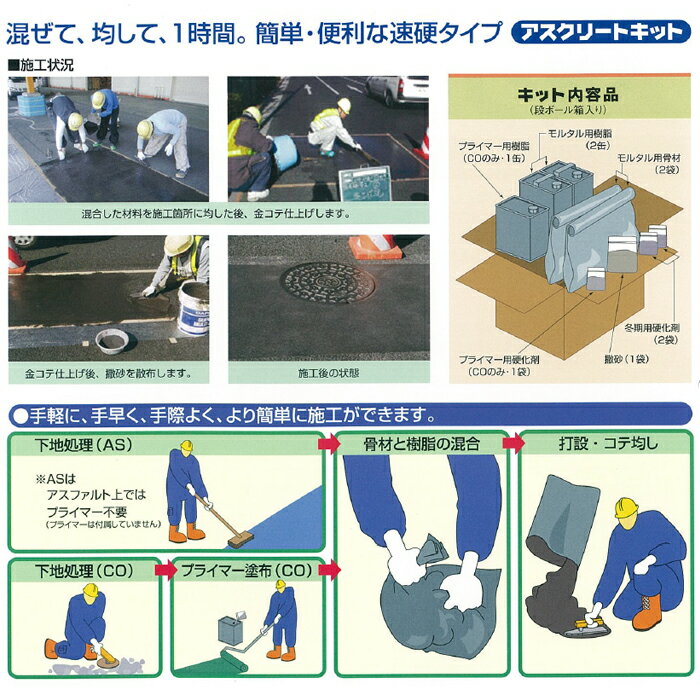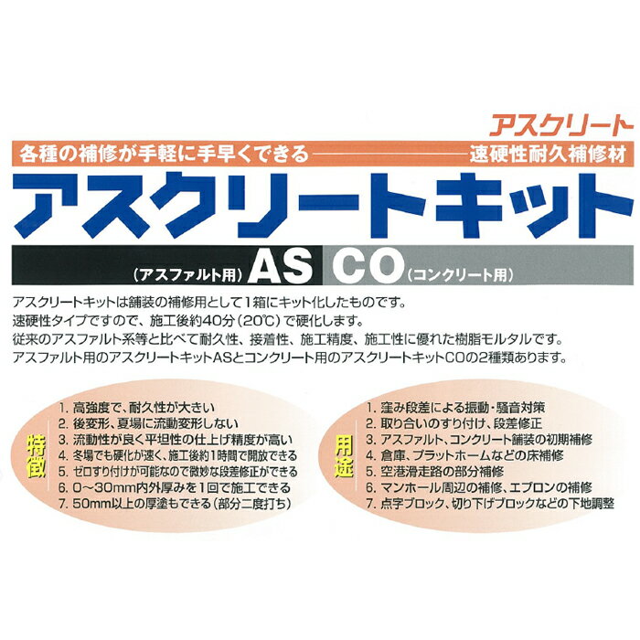 【メーカー公式】 コンクリート 補修材 アスクリートキット CO 美州興産 舗装補修材 ひび割れ補修 樹脂舗装 クラック 補修 段差 舗装 ひび割れ クラック くぼみ 修正 モルタル 超強度 コンクリート 樹脂モルタル 樹脂 速硬 簡易 高強度 MMA樹脂 メタクリル [ 20 kg / 箱 ]