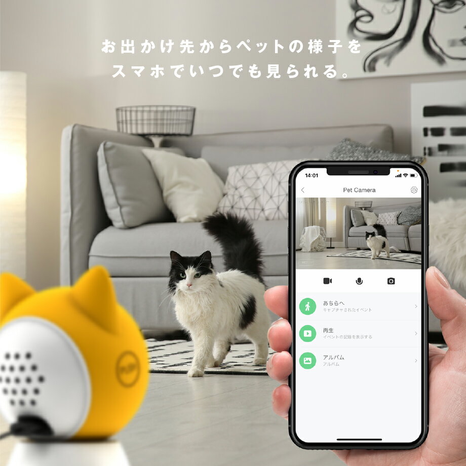 製品情報 外出先からスマホでモニターできるWiFiネットワークカメラ 1080PのHD高画質カメラにナイトビジョン機能を搭載 本体にマイク&スピーカーを内蔵し、双方向音声通信が可能 付属の両面テープで天井や壁への設置も可能な超軽量設計 設定した範囲の動きを検知して録画されるモーショントラックモード搭載 技術基準適合証明(技適)マークを取得済み 製品仕様 メーカー Petoneer 型番 PC002 JAN 4580416499224 製品名 Petoneer Smart Cam (ペットニア スマートカム) サイズ 77.3 × 55.4 × 50mm 重量 78g 電源 DC5V/1A 無線接続 Wi-Fi 2.4GHz 内容物 Smart Cam本体、USBType-Cケーブル(1.2m)、両面テープ、取扱説明書 注意点:モニター発色の具合により、実物とは色合いが異なる場合がございます。 製品の外観、仕様は改良のため、予告なく変更することがあります。 いつでも、どこでも。見える、聞こえる。 ゴハン食べたかな?寂しがっていないかな?そんな外出中の気になるペットの様子をライブで確認。マイクとスピーカーも搭載。外出先から声をかけたり、声を聞いたり。いつでもどこでもペットとの絆をつなげます。 設置場所は自由自在。超コンパクト&軽量設計。 高さ77mmのコンパクトサイズに加え、重量はわずか78g。付属の両面テープで天井や壁への設置も可能な超軽量設計。お気に入りの場所やトイレ前など気になる場所へ向けての設置はもちろん、日によって設置場所を変えたり、ペットの様子や状況に応じてフレキシブルな設置が可能です。 1080PのHD高画質カメラにナイトビジョン機能を搭載。 ペットのわずかな動きや変化もしっかりと確認できる1080Pの高画質カメラを採用。夜間の見守りにも安心のナイトビジョン機能も備えています。マイクロSDカード(上限128GB,別売)に最大でおよそ12日間の録画が可能。専用アプリを使うことで任意の時間の録画内容を見られます。 指定した範囲でペットが動くと録画を開始する、モーションゾーンの設定が可能です。設定したゾーンの外での動きには反応しません。 双方向スピーカー搭載。お留守番中のペットに優しく声をかけたり、カメラの向こうの鳴き声を聞くことができます。 暗所でも撮影が可能なナイトビジョン機能搭載。明るさが足りなくなると自動で赤外線LEDが点灯し、鮮明な映像を捉えます。 ◆◇◆楽天市場 猫用品・おもちゃで「1位」を獲得!!◆◇◆