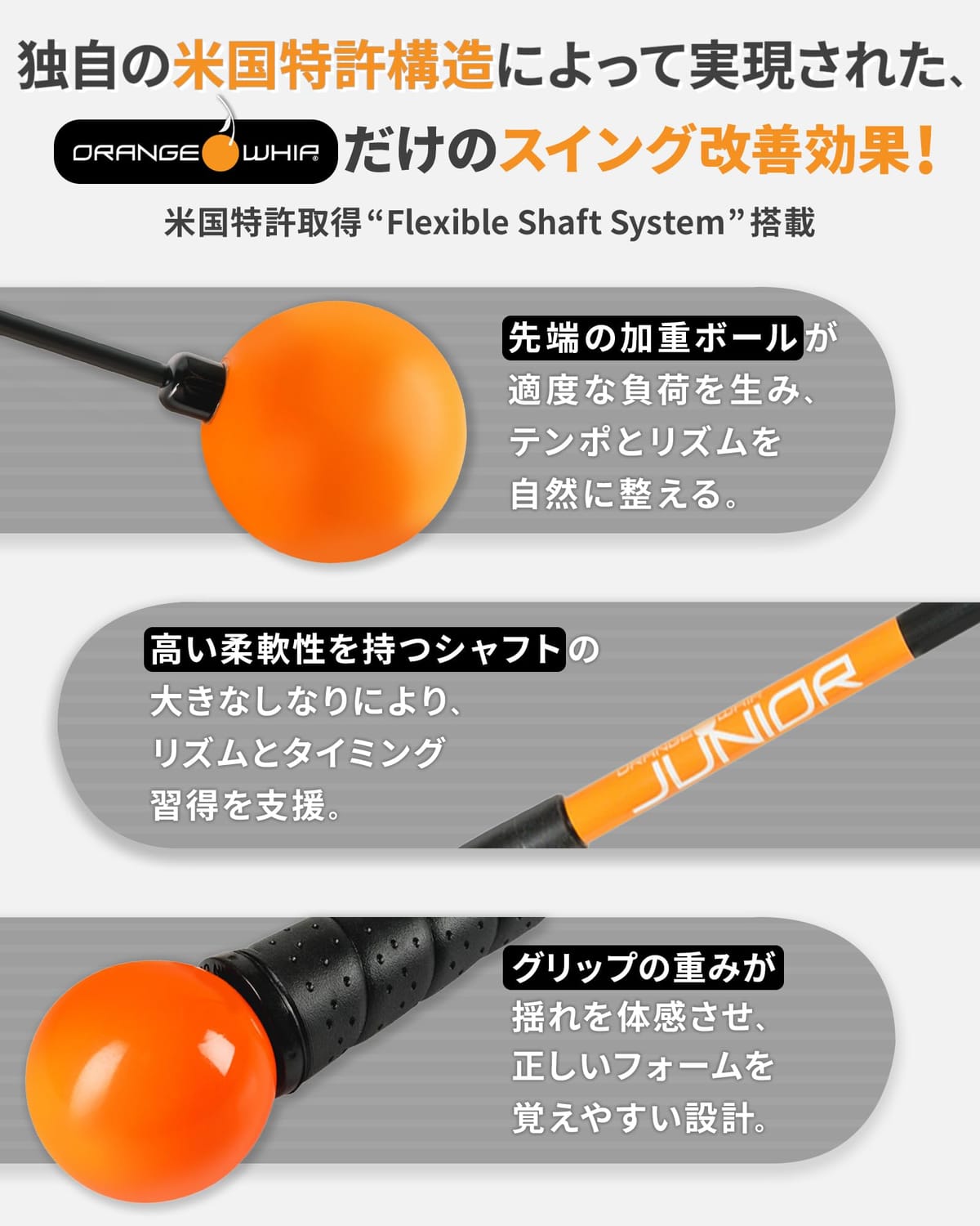 【”振るだけ”で自然と理想のスイングへ】 しなるシャフトと先端加重によりスイングのブレの違和感から自然と正しいスイングへ導かれる特許構造。体重移動やテンポ、バランスを自然に習得。【ヘッドスピード向上&体幹強化】 重量×しなり効果でインパクト直前にクラブが加速しやすく、ドライバー/アイアン共通で飛距離と弾道の安定、コア強化をサポート。【PGAプロ300名超導入/GRAA受賞】 世界累計80万本の実績。ツアープロやコーチが推奨し複数メディアで表彰。※メーカー公表値。【米国自社工場製・1年保証】 サウスカロライナ工場でハンドメイド生産。耐久性の高いABS樹脂ヘッド+カウンターウェイト構造で長持ち。日本語簡易説明書&問合せ窓口あり。【15分でウォームアップ】 ラウンド前に全身の筋温を高め柔軟性とコアを同時に鍛錬。室内トレーニングやリハビリにも最適。 Orange Whip(オレンジウィップ)は、”振るだけ”で自然と正しいスイングが身につくように設計されたゴルフ練習器具です。 しなるシャフトと重みのある米国特許構造により、ドライバーからアイアンまで共通するスイングリズムを感覚的に習得できます。 ウォームアップにも、飛距離アップにも効果的で、プロも多数使用している人気商品です。