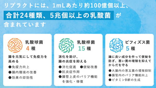 リプラに乳酸菌をプラスしました。 RIPLA+乳酸菌=RIPLACT 1mLあたり約100億個以上、合計24種類、5兆個以上の乳酸菌が含まれています。 腸内環境を整え、健康と美しさをサポート。 植物性発酵飲料 + 乳酸菌=RIPLACT リプラクトは10 0種類以上の植物から得られた発酵エキスと24 種類・ 5 兆個以上の乳酸菌の力で腸内環境をサポートする植物性発酵飲料です。 日々のケアに取り入れて、内側から輝く健康を目指しましょう。