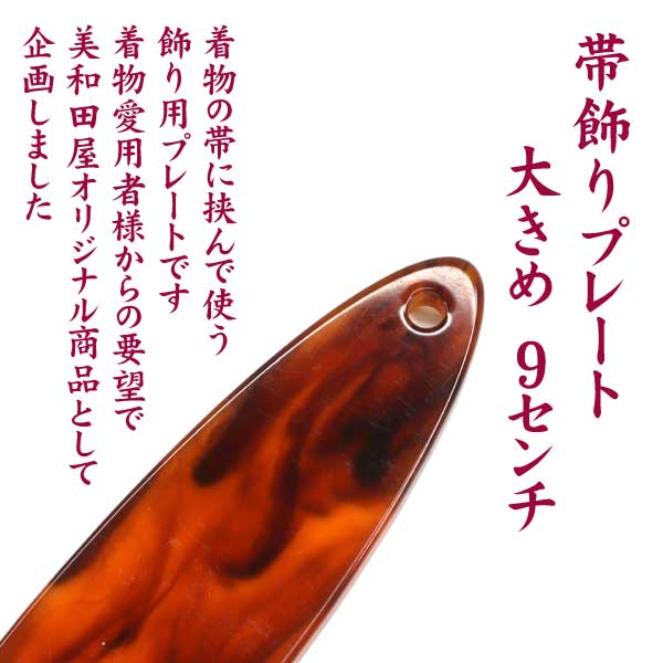帯飾りプレート(帯飾り根付板)パーツ べっ甲&黒の2色セット 美和田屋オリジナル 着物の帯に挟んで使う帯飾り用アクリルプレートです べっ甲&黒を各1枚の計2枚セットです ◆今なら「両根付紐(黒)2本」をプレゼント! メール便送料無料でお届けします *送料無料商品を同梱された場合3980円以下では送料無料になりません 着物愛用者様からのご要望で美和田屋オリジナル商品として企画しました! よくある6cm程度の帯飾りプレートは短くて落ちそうで怖かったとのこと これは9cmありしっかり収まります 少々重いものも安心! 着物美人におしゃれをプラス 着物男子に和装の粋を 別売りの根付紐(片方金具付き・両紐根付)と一緒にお好みのトップパーツをつけてご使用ください ◆ サイズ ◆ 長さ:約9cm 最大幅:約2cm 厚み:2〜3mm 穴径:3mm ◆ 個数 ◆ 各色1個 計2個 ◆ カラー ◆ べっ甲色、黒色 ◆ 素材 ◆ アクリル 使用方法の例1 両紐根付・・・紐の輪をトップパーツがくぐれる場合 帯板に根付紐の短い輪のほうを通し、長い輪のほうを短いほうの紐にくぐらせて締める トップパーツについている吊り下げカンに長い輪のほうを通し、通した輪にトップパーツをくぐらせる 使用方法の例2 両根付紐・・・紐の輪をトップパーツがくぐれない場合 と 金具付き根付紐の場合 帯板に根付紐の短い輪のほうを通し、長い輪のほうを短いほうの紐にくぐらせて締める トップパーツについている吊り下げカンをペンチで開け、または別途4〜5mmの丸カンを用意しトップパーツのカンと紐をつなげる(できれば2重カンまたはダブル丸カンがよい) 機械カットのため、始点終点がわかる跡が長辺中央サイドにありますが表に響いていないため良品としています 板表面にはカバーシートなどで覆ってはいません。そのため擦れがある場合があります 【美和田屋オリジナル】 大きめ帯プレートシリーズ 色はべっ甲、黒の2色 単品と10枚セット、べっ甲と黒の2色セットあります 取付用、各種丸カン・貼り付けパーツ等はこちら