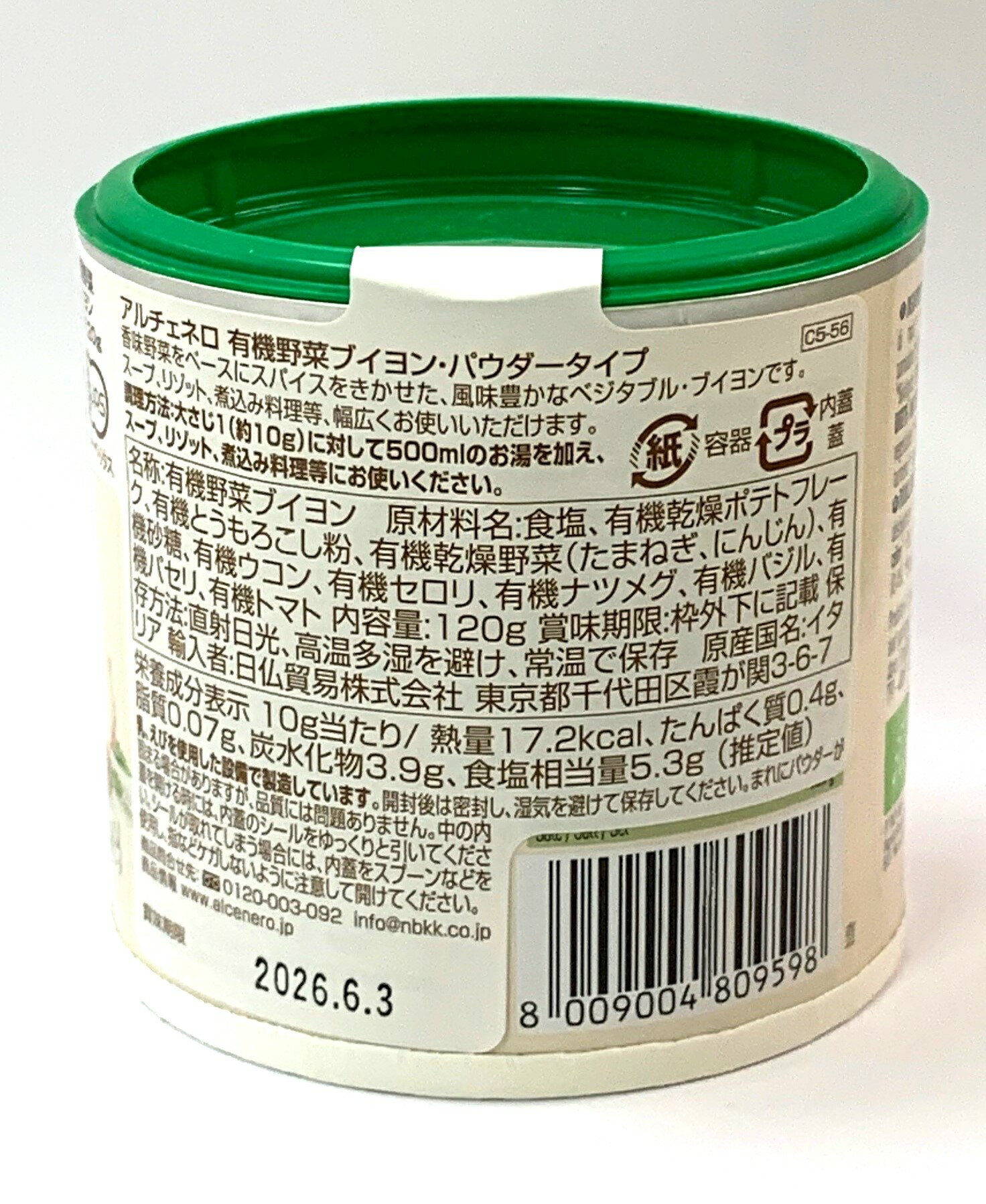 香味野菜をベースにスパイスをきかせた、風味豊かなベジタブル・ブイヨンです。 ※開封後は密封し、湿気を避けて保存してください。まれにパウダーが固まる場合がありますが、品質には問題ありません。中の内蓋を開ける時には、内蓋のシールをゆっくりと引いてください。シールが取れてしまう場合には、内蓋をスプーンなど使用し、指などケガしないように注意して開けてください。 原材料: 食塩、有機乾燥ポテトフレーク、有機とうもろこし粉、有機乾燥野菜(たまねぎ、にんじん)、有機砂糖、有機ウコン、有機セロリ、有機ナツメグ、有機バジル、有機パセリ、有機トマト 使い方: 大さじ1(約10g)に対して500mlのお湯を加え、スープ、リゾット、煮込み料理等にお使いください。 保存方法: 直射日光、高温多湿を避け、常温で保存。