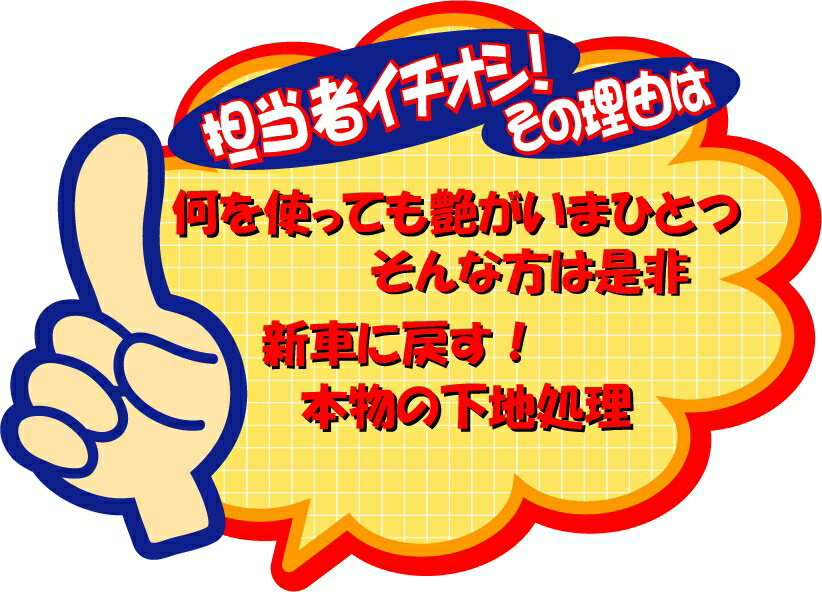 ●品名:ブリスハイブリッドコーティングコンパウンド●用途: 自動車塗装用保護・研磨剤●成分:ガラス繊維系ポリマー、研磨剤、石油系溶剤、界面活性剤●容量: 100ml ●品名:極細繊維クロス●用途:車・貴金属・家庭用品のお手入れ●繊維組成:ポリエステル80%ナイロン20%●品名:コンパウンド専用スポンジ●用途:自動車研磨施工用●組成:グリップ部ポリエチレン:作業面ポリエステル 使用上の注意:※ボトルをよく振ってからご使用下さい。※本来の用途以外には使用しないで下さい。※通気の良い所で使用して下さい。※艶なし部分(マット塗装)には使用しないで下さい。※塗ったまま放置せずに乾く前に拭き取って下さい。 ※削りすぎないように注意して下さい。※ボディの塗装面以外(未塗装バンパー、プラスチック、タイヤ、ゴム、ガラス等)には使用しないで下さい。プラスチック部分に使用する際は十分注意が必要です。 ※拭き取りにくい場合は、濡れたクロスと乾拭き用クロスの二種類を用意して交互に拭きあげて下さい。※色落ちやシミの原因になる恐れがある再塗装や劣化した塗装には使用しないで下さい。 ※使用後は石鹸でよく手を洗って下さい。※深い傷は除去できません。※本製品は研磨を行う液剤ですので使用頻度にご注意下さい。※極細繊維クロスは水温40℃以下の手洗いで洗って下さい。柔軟材や漂白剤・アイロンは使用しないで下さい。※コンパウンド専用スポンジは非常にデリケートに作られていますので水洗い洗車時には使用しないで下さい。また使用後はよく乾燥させてから保管し地面に落としたスポンジは使用しないで下さい(砂等の異物が付着し傷の原因となります)応急処置:◆肌の敏感な方は保護手袋をご使用下さい。◆眼に入った場合は流水で良く洗眼し、医師の診断を受けて下さい。◆誤って飲み込んだ場合は、コップ1〜2杯分の牛乳か水を飲む等の処置をし、ただちに医師の診断を受けて下さい。保管方法:◆使用後はキャップを完全に閉めて下さい。◆高温の場所や直射日光のあたる場所には保管しないで下さい。◆室温で保管して下さい。◆強風時は使用をさけて下さい。◆幼児の手の届かない所に保管して下さい。 <セット内容> 超高性能ガラス繊維系コンパウンド ブリスハイブリッドコーティングコンパウンド 100ml コンパウンド専用スポンジ 40×65×100mm 極細繊維クロス 300×400mm新車に戻す!本物の下地処理 洗車傷や輪ジミを落としてブリスコーティング前に完璧な下地処理を!洗車傷や輪ジミ・水垢を落とし綺麗なボディを作ってから「ブリス」等のコーティング剤でコーティングすることで 「ブリス」の性能を最大限に発揮し効果期間を延ばしボディをより輝かせることができます。 「ブリスハイブリッドコーティングコンパウンド」は、どんなコーティングの下地処理にも1本で対応できる超高性能ガラス繊維系コンパウンドです。 ■こんな方にオススメ ・洗車傷をなくしたい!・水垢を除去したい!・普通のコンパウンドは難しそう…・いろいろな種類の洗車用品を買いたくない…・コーティングの効果期間を延ばしたい!・とにかく綺麗な輝く車に乗りたい! 使用方法 1, 施工車両を水洗いし乾拭き後に洗車傷や繊細傷のついている部分を確認します。洗車傷は、ボンネットや天井部に多くついています。 洗車傷は洗車時にスポンジ等がこすれることにより発生する渦巻き状についている傷です。繊細傷はドアノブ付近等、爪や服がこすれる部分に多くついています。 ※光を当てることで確認しやすくなります。 2, 付属のクロスに液剤をよく振ってから数滴つけ指で強めに圧力をかけしっかりこすって落とします。 ※ 本製品は研磨粒子が2μ〜0.2μに変化します。 ※ 繊細傷を除去する場合、研磨能力に衰えを感じたら新しい液剤を付け足しながらご使用下さい。 ※ 強めに50回ほどこすっても除去できない場合は、塗料等で傷を埋め完全乾燥後に作業を行いましょう。 ※ 液剤は4層分離していますのでよく振ってからご使用下さい。 3, 深い傷の除去が終わったらボディ全体に付いている洗車傷をスポンジにクロスを巻きつけ液剤を適量つけて研摩除去します。 ※ 専用クロスで均一の圧力をかけ研磨することで全体の研磨に適した研磨粒子に整えて作業することができます。 ※ 円を描くように使用しないで前後左右と直線的に研磨して下さい。 ※ クロスの綺麗な面を使用して作業して下さい。 ※ 滑りが悪くなったら液剤を付け足しながら作業を行って下さい。 ※ 1面ずつ仕上げていきましょう。 ※ 除去できない傷があった場合は上記の作業に戻って除去して下さい。 4, スポンジに液剤をつけて全体的に研磨を行い最終仕上げ作業完了です。作業完了時にボディはコーティングされた状態になっています。 ※ 本製品は研磨粒子が2μ〜0.2μに変化します。削れすぎないように調整しておりますので最終仕上げ作業は必ず付属のスポンジで行って下さい。 ※ 仕上げ作業完了後にボディは
