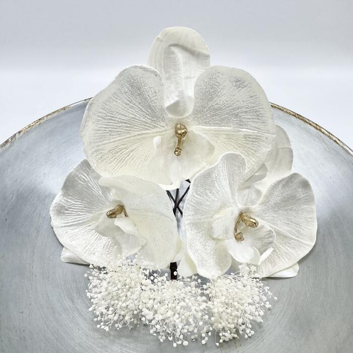 【おまけ付】ヘッドドレス【ケース付き】【ベロア 胡蝶蘭 3輪 & かすみ草 3本】造花 髪飾り 結婚式 成人式 卒業式 ブライダル 白無垢 色打掛 花嫁 和装 着物 アーティシャルフラワー シルクフラワー 花 ヘアアクセサリー コチョウラン こちょうらん ウェディングヘッドドレス
