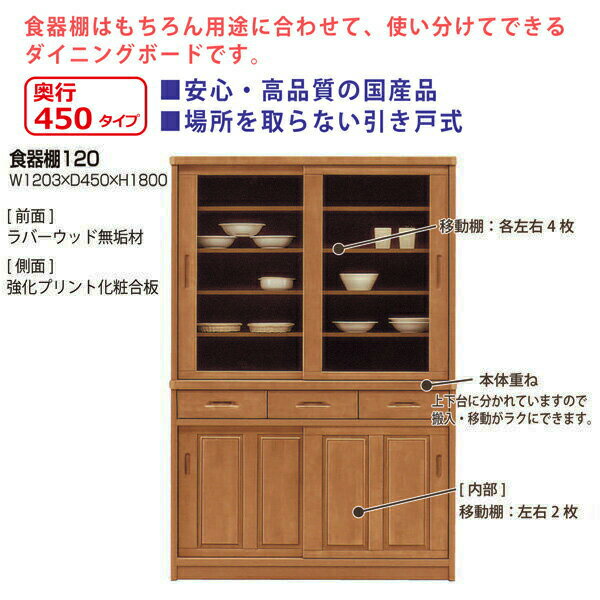 食器棚 幅120 奥行45 高さ180 ダイニングボード 引き戸 スライド 引き出し キッチンボード 国産 ナチュラル ブラウン