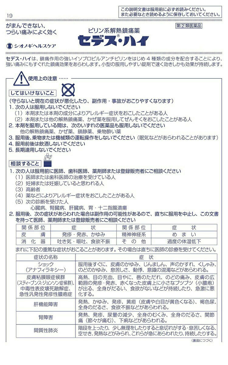 セデス・ハイ 商品説明 『セデス・ハイ 』 セデス・ハイは、鎮痛作用の強いイソプロピルアンチピリンをはじめ4種類の成分を配合することにより、強い痛みにもすぐれた鎮痛効果をあらわします。小型の服用しやすい錠剤で速く効きしかも効果が持続します。 【セデス・ハイ 詳細】 1錠中 イソプロピルアンチピリン 75mg アセトアミノフェン 125mg アリルイソプロピルアセチル尿素 30mg 無水カフェイン 25mg 添加物として カルメロースカルシウム(CMC-Ca)、クロスカルメロースナトリウム(クロスCMC-Na)、ポビドン、ステアリン酸マグネシウム、結晶セルロース、トウモロコシデンプン、乳糖水和物、ヒドロキシプロピルセルロース を含有。 原材料など 商品名 セデス・ハイ 内容量 20錠 販売者 シオノギヘルスケア株式会社 保管及び取扱い上の注意 (1)直射日光の当らない湿気の少ない、涼しい所に保管してください。 (2)小児の手の届かない所に保管してください。 (3)PTPシートから出して他の容器に入れ替えないでください。 (誤用の原因になったり、品質が変化します) (4)使用期限をすぎた製品は、服用しないでください。 用法・用量 次の量をなるべく空腹時をさけて、水またはぬるま湯でおのみください。 また、おのみになる間隔は4時間以上おいてください。 [年齢:1回量:1日服用回数] 成人(15才以上):2錠:3回を限度とする 15才未満:服用させないこと ●定められた用法・用量を厳守してください。 ●錠剤の取り出し方 錠剤の入っているPTPシートの凸部を指先で強く押して裏面のアルミ箔を破り、取り出しておのみください。(誤ってそのまま飲み込んだりすると、食道粘膜に突き刺さるなど思わぬ事故につながることがあります) 効果・効能 頭痛・月経痛(生理痛)・歯痛・神経痛・腰痛・外傷痛・抜歯後の疼痛・咽のど痛・耳痛・関節痛・筋肉痛・肩こり痛・打撲痛・骨折痛・捻挫痛の鎮痛、悪寒・発熱時の解熱 ご使用上の注意 (守らないと現在の症状が悪化したり、副作用・事故がおこりやすくなります)1.次の人は服用しないでください (1)本剤または本剤の成分によりアレルギー症状をおこしたことがある人 (2)本剤または他の解熱鎮痛薬、かぜ薬を服用してぜんそくをおこしたことがある人 2.本剤を服用している間、次のいずれの医薬品も服用しないでください 他の解熱鎮痛薬、かぜ薬、鎮静薬、乗物酔い薬 3.服用後、乗物または機械類の運転操作をしないでください(眠気などがあらわれることがあります) 4.服用前後は飲酒しないでください 5.長期連用しないでください1.次の人は服用前に医師、歯科医師、薬剤師または登録販売者にご相談ください (1)医師または歯科医師の治療を受けている人 (2)妊婦または妊娠していると思われる人 (3)高齢者 (4)薬などによりアレルギー症状をおこしたことがある人 (5)次の診断を受けた人 心臓病、腎臓病、肝臓病、胃・十二指腸潰瘍 2.服用後、次の症状があらわれた場合は副作用の可能性があるので、直ちに服用を中止し、この文書を持って医師、薬剤師または登録販売者にご相談ください [関係部位:症状] 皮膚:発疹・発赤、かゆみ 消化器:吐き気・嘔吐、食欲不振 精神神経系:めまい その他:過度の体温低下 まれに次の重篤な症状がおこることがあります。その場合は直ちに医師の診療を受けてください。 [症状の名称:症状] ショック(アナフィラキシー):服用後すぐに、皮膚のかゆみ、じんましん、声のかすれ、くしゃみ、のどのかゆみ、息苦しさ、動悸、意識の混濁などがあらわれる。 皮膚粘膜眼症候群(スティーブンス・ジョンソン症候群)、中毒性表皮壊死融解症、急性汎発性発疹性膿疱症:高熱、目の充血、目やに、唇のただれ、のどの痛み、皮膚の広範囲の発疹・発赤、赤くなった皮膚上に小さなブツブツ(小膿疱)が出る、全身がだるい、食欲がないなどが持続したり、急激に悪化する。 肝機能障害:発熱、かゆみ、発疹、黄疸(皮膚や白目が黄色くなる)、褐色尿、全身のだるさ、食欲不振などがあらわれる。 腎障害:発熱、発疹、尿量の減少、全身のむくみ、全身のだるさ、関節痛(節々が痛む)、下痢などがあらわれる。 間質性肺炎:階段を上ったり、少し無理をしたりすると息切れがする・息苦しくなる、空せき、発熱などがみられ、これらが急にあらわれたり、持続したりする。 ぜんそく:息をするときゼーゼー、ヒューヒューと鳴る、息苦しいなどがあらわれる。 3.服用後、次の症状があらわれることがあるので、このような症状の持続または増強が見られた場合には、服用を中止し、この文書を持って医師、薬剤師または登録販売者にご相談ください 眠気 4.5 〜 6 回服用しても症状がよくならない場合は服用を中止し、この文書を持って医師、歯科医師、薬剤師または登録販売者にご相談ください ◆ 医薬品について ◆医薬品は必ず使用上の注意をよく読んだ上で、 それに従い適切に使用して下さい。 ◆購入できる数量について、お薬の種類によりまして販売個数制限を設ける場合がありま