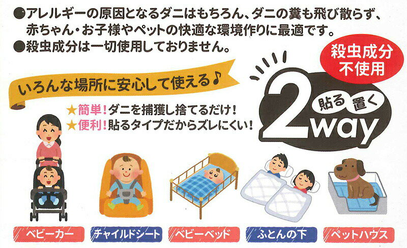ヨック ダニ捕りシート 5枚入 商品説明 『ヨック ダニ捕りシート 5枚入 』 ズレない貼る(置く)だけでダニすっきり。 ダニの捕獲を目的として開発された特殊誘引剤(食品添加物)が、ダニをシートに引き寄せる。 集めたダニはそのままポイッ! 殺虫成分不使用なのでお子様やペットのいる家庭でも安心してご使用いただけます。 【ヨック ダニ捕りシート 5枚入 詳細】 原材料など 商品名 ヨック ダニ捕りシート 5枚入 原材料もしくは全成分 不織布、食品添加物、アクリル系粘着剤 内容量 5枚入 製造国 日本 販売者 ヨック ご使用方法 ・袋から取り出しご使用ください。貼り付けてご使用される場合は、接着紙を取り外して下さい。 ・約3か月後が交換目安となります。 【設置例】 ベビーカー、チャイルドシート、ベビーベット、ふとんの下、ペットハウス 広告文責 株式会社プログレシブクルー072-265-0007 区分 日用品【20個セット】ヨック ダニ捕りシート 5枚入×20個セット