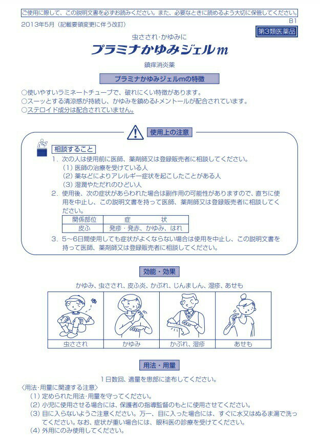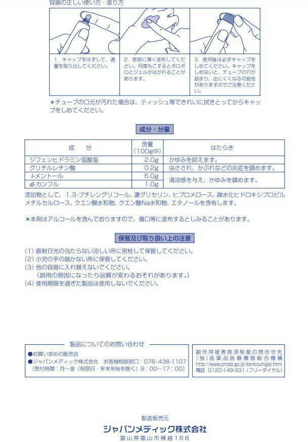プラミナかゆみジェルm 商品説明 『プラミナかゆみジェルm 』 ○使いやすいラミネートチューブで,破れにくい特徴があります。 ○スーッとする清涼感が持続し,かゆみを鎮めるl-メントールが配合されています。 ○ステロイド成分は配合されていません。 【プラミナかゆみジェルm 詳細】 100g中 ジフェンヒドラミン塩酸塩 2.0g グリチルレチン酸 0.2g l-メントール 5.0g dl-カンフル 1.0g 添加物として 1,3-ブチレングリコール,濃グリセリン,ヒプロメロース,疎水化ヒドロキシプロピルメチルセルロース,クエン酸水和物,クエン酸ナトリウム水和物,エタノール を含有。 原材料など 商品名 プラミナかゆみジェルm 内容量 20g 販売者 ジャパンメディック(株) 保管及び取扱い上の注意 (1)直射日光の当たらない涼しい所に密栓して保管してください。 (2)小児の手の届かない所に保管してください。 (3)他の容器に入れ替えないでください。 (誤用の原因になったり品質が変わるおそれがあります。) (4)使用期限を過ぎた製品は使用しないでください。 用法・用量 1日数回,適量を患部に塗布してください。 (1)定められた用法・用量を守ってください。 (2)小児に使用させる場合には,保護者の指導監督のもとに使用させてください。 (3)目に入らないようご注意ください。万一,目に入った場合には,すぐに水又はぬるま湯で洗ってください。なお,症状が重い場合には,眼科医の診療を受けてください。 (4)外用にのみ使用してください。 効果・効能 かゆみ,虫さされ,皮ふ炎,かぶれ,じんましん,湿疹,あせも ご使用上の注意 1.次の人は使用前に医師,薬剤師又は登録販売者に相談してください。 (1)医師の治療を受けている人 (2)薬などによりアレルギー症状を起こしたことがある人 (3)湿潤やただれのひどい人 2.使用後,次の症状があらわれた場合は副作用の可能性がありますので,直ちに使用を中止し,この説明文書を持って医師,薬剤師又は登録販売者に相談してください。 [関係部位:症状] 皮ふ:発疹・発赤,かゆみ,はれ 3.5〜6日間使用しても症状がよくならない場合は使用を中止し,この説明文書を持って医師,薬剤師又は登録販売者に相談してください。 ◆ 医薬品について ◆医薬品は必ず使用上の注意をよく読んだ上で、 それに従い適切に使用して下さい。 ◆購入できる数量について、お薬の種類によりまして販売個数制限を設ける場合があります。 ◆お薬に関するご相談がございましたら、下記へお問い合わせくださいませ。 株式会社プログレシブクルー 072-265-0007 ※平日9:30-17:00 (土・日曜日および年末年始などの祝日を除く) メールでのご相談は コチラ まで 広告文責 株式会社プログレシブクルー072-265-0007 商品に関するお問い合わせ 会社名:ジャパンメディック株式会社 問い合わせ先:お客様相談窓口 電話:076-438-1107 受付時間:月〜金(祝祭日・年末年始を除く)9:00〜17:00 区分 日本製・第3類医薬品 ■医薬品の使用期限 医薬品に関しては特別な表記の無い限り、1年以上の使用期限のものを販売しております。 それ以外のものに関しては使用期限を記載します。医薬品に関する記載事項はこちら【第3類医薬品】ジャパンメディック プラミナかゆみジェルm 20g×5個セット