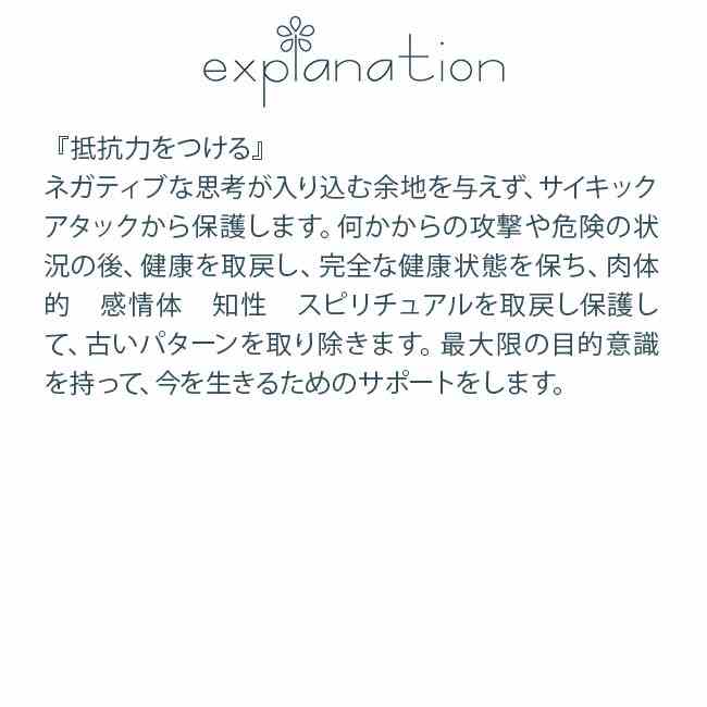 メーカー Pacific Essences シリーズ名 パシフィックエッセンス 単品名称 オプティマルイミュニティ 原材料 水・海塩・アルコール類・その他 内容量 25ml 賞味期限 パッケージに記載 製造者 Pacific Essences 生産国 カナダ 輸入者 ネイチャーワールド(株) 資料提供 ネイチャーワールド(株) 使用上の注意 ラベルのデザインが変更になる場合がございます。予めご了承ください。 本品は化粧品や医薬品ではありません。 効果は個人によって異なり、特定の効果を保証するというものではありません。 広告文責 (株)B-CRUISE(0362724460) キーワード Optimal Immunity『抵抗力をつける』 ネガティブな思考が入り込む余地を与えず、サイキックアタックから保護します。何かからの攻撃や危険の状況の後、健康を取戻し、完全な健康状態を保ち、肉体的 感情体 知性 スピリチュアルを取戻し保護して、古いパターンを取り除きます。 最大限の目的意識を持って、今を生きるためのサポートをします。 ■使用方法 ・1回11滴を1日3〜4回を舌の下に落とし数秒間とどめるようにして飲む。 ・お水やハーブティーに落として飲む。 ・気になる部分や脈、チャクラなど体の気になる部分につける。 ・エッセンスボトルを身に付ける。 ・お風呂に11滴落として入浴する。 ・クリームや化粧品に混ぜて使う。 ※緊急時やエッセンスをとても必要とする時は量を増やすのではなく使用回数を増やしてください。 ※滴数はオススメの量です。自分が必要だと思った滴数をお取りください。 ■使用上の注意 こちらのコンビネーションエッセンスはストックエッセンスではないのでトリートメントボトルを作ることはできません。 ■その他の使い方 ペットには飲み水や餌に混ぜて、植物にはじょうろの水に入れて与えることができます。 ■保存方法 直射日光を避け保管してください。