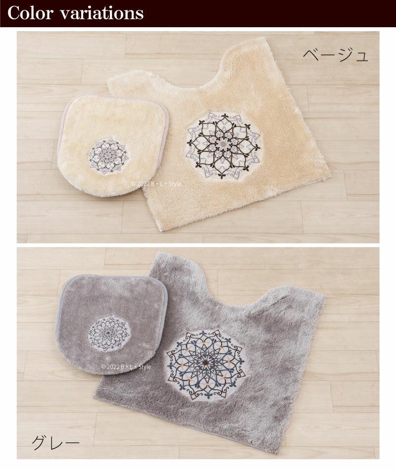 Item Spec 【トイレマット】 ■サイズ:約 縦65×横65cm(アールより手前:約50cm) ■素材:アクリル100%(吸水素材) ■裏面:すべりにくい加工 ■生産国:インドネシア 【兼用フタカバー(普通便座&温水洗浄・暖房便座兼用)】 ■※サイズ・取付方法の詳細をご確認ください ⇒ サイズを確認する ■素材:アクリル100%(吸水素材) ■生産国:インドネシア 【全アイテム共通】 ■カラー:グレー・ベージュ Attention ! 【トイレマット】 ・ワックスやコーティングされている床面に敷くと、マットの裏加工材が柔らかくなり付着することがあります。 ・同じ場所に長期間敷きっぱなしにすると、木質系や塩ビの床にマットの裏加工材が付着したり、床材が変色することがありますので、一週間に一度はマットを取り除いて床面を拭いてください。 ・一部の型式(ドラム式)の洗濯機では、洗濯や脱水ができない場合がありますので、洗濯機の取り扱い説明書をよくご確認の上、洗濯してください。 ・洗濯時に多少色落ちしたり遊び毛が出ますので、必ず洗濯ネットに入れ、他の衣類とは別にして洗濯してください。また、色が変色したり吸水性が損なわれることがありますので、塩素系洗剤、漂白剤、柔軟剤は使用しないでください。 ・マットの裏加工材が溶けたり商品が縮む可能性がありますので、乾燥機(洗濯機についている乾燥機も含む)は使用しないでください。 【兼用フタカバー】 ・洗濯時に多少色落ちしたり、毛羽落ちすることがありますので、他の衣類といっしょに洗濯しないでください。 ・塩素系洗剤、漂白剤、柔軟剤は使用しないでください。 ・洗濯機の弱回転で丸洗いをしたあと脱水機にかけ、形を整えてから陰干ししてください。 ・乾燥機は使用しないでください。 ● 便フタが濡れていたり、ほこりが付いていると吸着しませんので、便フタの表面をよく拭いてから使用してください。 ● 最初は吸着力が強いので取り付けにくい場合がありますが、1-2度洗濯すると吸着力が落ち着いて取り付けやすくなります。 ● 吸着力が弱くなったり、吸着しなくなった場合は、吸着面をタオルで軽く水拭きして湿らせると吸着するようになります。 ● 直接日光に当たると、劣化して吸着しなくなりますのでご注意ください。 ※ お客様のモニタ環境等により実際のカラーと多少異なる場合がございます。ご了承の上ご注文くださいますようお願いいたします。 ※ 当店は、当社が運営する他モールのショップや自社サイトと在庫を共有しており、同時にご注文が入った場合、まれに欠品する場合がございます。その際には、サイズやカラー等の変更・キャンセルをお願いする場合がございます。 【セット内容】 ★商品の詳細は単品販売ページでご確認下さい 1:トイレマット(65×65cm) 2:兼用フタカバー ※ トイレマットのサイズにご注意下さい ※ フタカバーの対応表をご確認下さい ※ 単品での販売もございます トイレタリーシリーズ 【M+home】ミーナ ペルシャの陶器柄(ミーナカーリー)をモダンにアレンジしたデザインは、刺繍と コード刺繍の組み合わせが立体的で、ゴージャス感を感じます。M+homeらしい モダンな色合いとデザインで、ベースの糸使いは細番手の光沢糸を使用。 モダンでラグジュアリーなマットが、サニタリー空間をハイグレードに演出します。 シリーズアイテムはこちら セット販売はこちら トイレマット 65×65cm のセット トイレマット 95×65cm のセット ▼ コーディネート用便座カバーはこちら ▼ トイレタリーは衛生商品です。商品発送後のサイズ間違いやイメージ違いなどのお客様のご都合による返品・交換には未開封であってもご対応ができません。事前に十分ご確認の上、ご注文下さい。ご不明点はお調べしますので機種番号を確認してお問い合わせください。