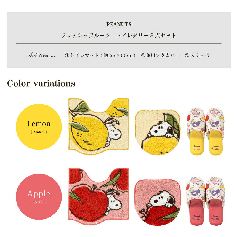 スヌーピー トイレ3点セット「フレッシュフルーツ」( トイレマット /58×60cm 兼用フタカバー スリッパ )[ snoopy りんご レモン トイレタリーセット トイレカバー トイレマット セット 吸着タイプ キャラクター かわいい ピーナッツ センコー ]24AW レッド イエロー