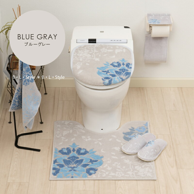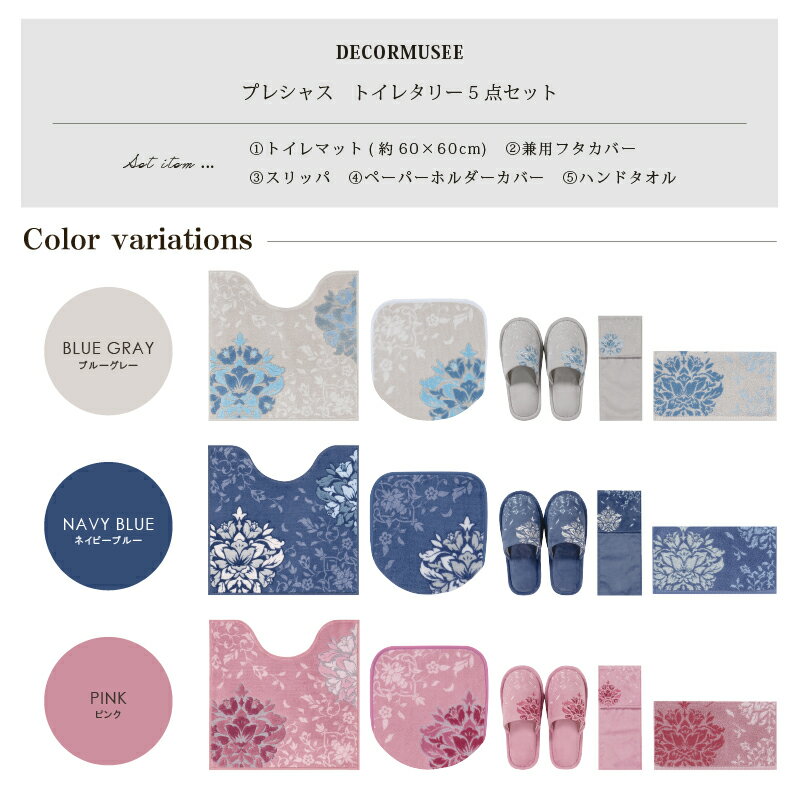 トイレ 5点セット 「プレシャス」( トイレマット /60×60cm 兼用フタカバー スリッパ ペーパーホルダーカバーN タオル )[ トイレカバー セット おしゃれ 上品 モダン トイレタリー 洗える DECORMUSEE デコールミュゼ センコー ]24AW ブルーグレー ネイビーブルー ピンク