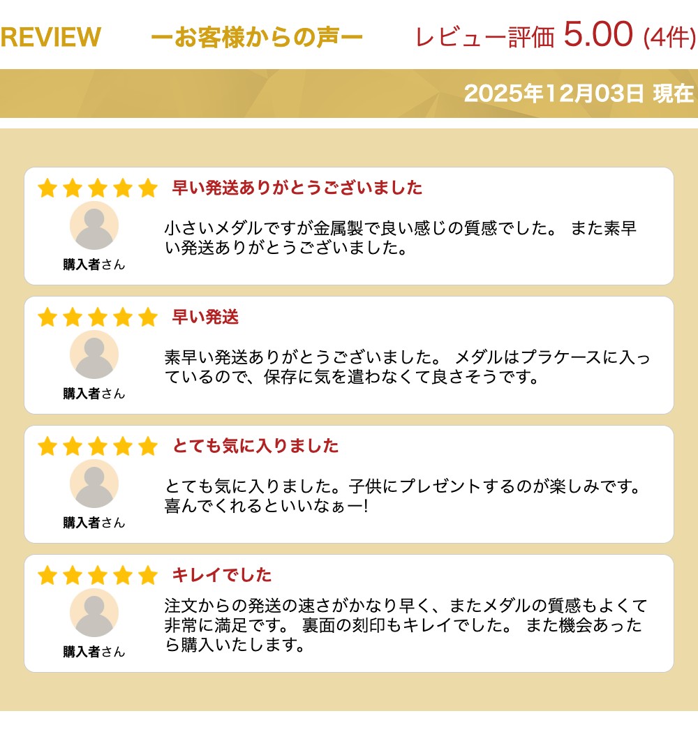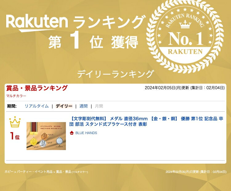 商品情報素材本体:真鍮製重量61〜67g対応競技MVP/賞/地球/No.1/ハト/鳳凰/女神/ワシ/運動会/駅伝/トライアスロン/ランナー/陸上競技/アメリカンフットボール/グラウンドゴルフ/ゲートボール/ゴルフ/サッカー/サッカーBEST11/フットサル/スカッシュ/ソフトボール/卓球/テニス/ソフトテニス/ドッジボール/パークゴルフ/バスケットボール/バスケットボールBest5/バドミントン/バレーボール/ハンドボール/ビーチバレー/ビーチボール/ビリヤード/フットゴルフ/ペタンク/ボウリング/野球/野球Best9/ラグビー/ラクロス/合気道/空手道/弓道/剣道/銃剣道/柔道/相撲/テコンドー/フェンシング/ボクシング/レスリング/ウインドサーフィン/カイトボード/カヌー/サーフィン/水泳/水上バイク/スタンドアップパドルボード/ボート/ボディボード/ヨット/アイスホッケー/クロスカントリー/スキー/スキージャンプ/スキーモーグル/スノーボード/スピードスケート/フィギュアスケート/エアロビクス/クラシックバレエ/新体操/体操/ダンス/ダンスラテン/チアリーディング/トランポリン/フォークダンス/アーチェリー/クライミング/射撃/重量挙げ/乗馬/スケートボード/スラックライン/綱引き/ボルタリング/ローラースケート/一輪車/カーレース/自転車/BMX/モトクロス/音楽/カラオケ/ピアノエレクトーン/学習/作文コンクール/珠算/書道/川柳/短歌/俳句/囲碁/ウォーキング/園芸ガーデニング/絵画コンクール/カメラ/けん玉/座釣り/将棋/ダーツ/凧上げ/登山/花(菊)/百人一首/フィッシング/盆栽/麻雀/祭り/ミニレースカー/民謡/ヨーヨー/ラジコン/赤ちゃん/セールスマン/ドローン/ヘアーカット/料理/犬/馬/鯉/伝書鳩/肉牛/乳牛/猫/豚/QC/警察/自衛隊/消防署/消防団関連キーワードド トロフィー/カップ/ブロンズ/楯/表彰楯/クリスタル/ブロンズ/競技/趣味/娯楽/大会/大きい/重たい/豪華/金メダル/銀メダル/銅メダル/首掛け/表彰式/卒団/卒業/記念/記念品関連商品【文字彫刻無料】★楽天1位★ 表彰メダル(マイティメダル)【金・銀・銅...【名入無料】★楽天1位★ SMメダル 40mm Aセット プラスチック...【名入無料】★楽天1位★ SMメダル 40mm Cセット PPケース(...1,500円1,144円1,072円【名入無料】 ★楽天1位★ LMメダル 53mm(金・銀・銅) プラス...【名入無料】★楽天1位★ LMメダル (金・銀・銅) プラスチックケー...【文字彫刻無料】 ★楽天1位★角型 メダル QM【金・銀・銅】記念品 ...2,073円2,431円1,337円【文字彫刻無料】★楽天1位★ メダル (MJメダル)【金・銀・銅】 直...【名入れ無料】★楽天1位★ メダル 直径63mm 【金・銀・銅】選べる...【10%OFF☆スーパーSALE】★楽天1位★【名入無料】SMカラー ...890円2,390円611円★楽天1位★【名入無料】SMカラー メダル 直径40mm (金・銀・銅...【名入無料】SMメダル 40mm Bセット プラケース(金・銀・銅)直...【名入無料】★楽天1位★ ドラえもんメダル 直径70mm(金・銀・銅)...679円965円2,156円【文字彫刻代無料】★楽天1位★ メダル 直径36mm 【金・銀・銅】 優勝 第1位 首掛けリボン・スタンドケース入 記念品 優勝 卒団 卒業 景品 大会 卒団記念 スポーツ 部活 ケース付 イベント 記念 トロフィー <直径36mm>スタンド式プラケース入り MY8367 裏面にプレート彫刻出来ます【無料】図柄は、28点からお選びできます!● メダルサイズ:直径36mm● リボン付・スタンド式透明プラケース入● ケースサイズ(140×49×19)● プレートサイズ(27×30)● 本体:真鍮製 2