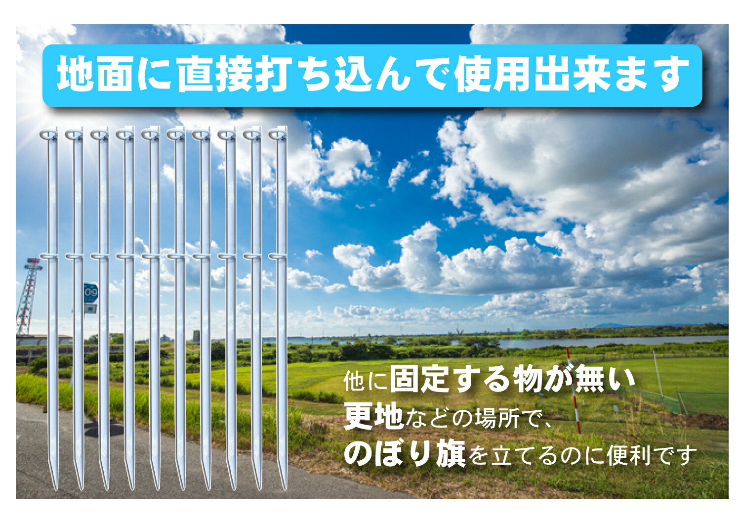 関連商品【送料無料】★楽天1位★のぼり台 のぼり竿用 お得な 5台セット 鉄製...★楽天1位★ のぼり用 スタンド 注水式 倒れにくい 20L 5台セッ...【送料無料】のぼり台 タイヤ踏み式 お得な 4台セット 鉄製スタンド ...11,900円12,480円10,800円【送料無料】のぼり旗用 金属杭 白 5本セット ★楽天1位★のぼり 幟...★楽天1位★ のぼりポール 2.4m まとめ買いセット(2段 伸縮/横...のぼりポール用回転頭10個セット【送料無料】★楽天1位★安心の日本製一...10,350円3,999円1,660円【送料無料!】のぼり 旗 白 無地(高さ180×巾60)(3枚セット)...★楽天1位★ のぼり スタンド ミニ 卓上 お得な 10本セットスタン...日本国旗 【テトロンツイル】サイズ:140cm×210cm ポリエステ...2,480円2,690円14,290円【送料無料!!】アルミ伸縮ポール 5m(4段伸縮)楽天1位♪縮長 14...★楽天1位♪★ 日本国旗 【エクスラン】サイズ:100cm×150cm...日本国旗 【エクスラン】サイズ:180cm×270cmアクリル100%...11,990円10,390円19,950円のぼり旗用 金属杭 白 10本セット【送料無料】★楽天1位★のぼり 幟 杭 旗 ポール 10本セット 店舗 イベント 伸縮 台 業務用 白 ホワイト ポール立て 鉄製 埋め込み式 かんたん設置 丈夫 スタンド 地面に直接打ち込めるように先端が杭状になっている鉄製ポール立てのお得な10本セットです。 ※ サイズ:長さ109cm×25mm×25mm※ リング径:外径49mm×内径35mm※ 材質:鉄製(白塗装)ポールを差し込むリングが2か所あります。内径が35mmとなっておりますのでお手持ちのポールの口径をご確認してからご検討、ご購入ください。 2