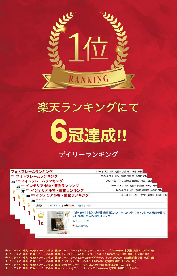 商品情報★おすすめの用途年間行事:新年/成人式/父の日/夏のギフト/敬老の日/ハロウィーン/クリスマス/年末年始の贈り物誕生・長寿のお祝い:誕生日/還暦(60歳)/古希(70歳)/喜寿(77歳)/傘寿(80歳)職場・ビジネス:昇進お祝い/定年お祝い/退職お祝い/退職記念品/新入社員歓迎/送迎会/送別会/ビジネスイベント/プロモーショナルアイテムスポーツ・イベント:優勝祝い/トロフィー/ゴルフのホールインワン/スポーツ用表彰状/参加賞特別な場合:退職お祝い(男性)/船の進水式/地鎮祭/コンペティション年齢別ギフト:30代/40代/50代/60代/70代テーマ別:ガジェット/父の日特集/実用品/ビジネスアイテム/スポーツ用品/アウトドアギア/おしゃれなアクセサリー/高級腕時計/アウトドア/フィッシング/ゴルフ/釣り/ビール/お酒/宴会/キャンプ/車中泊/ソロキャンプ/バイク/ツーリング/オートバイ/カメラ関連商品【送料無料】【名入れ無料】フォトフレーム 名入れ クロック ★楽天1位...【送料無料】【名入れ無料】フォトフレーム 名入れ クロック ★楽天1位...KEVNHAUN スクウェアカッティングボード&ランチトレイ★楽天1位...4,680円3,744円4,650円【送料無料】 ★楽天1位★ ●フォトフレーム クロック 【名入れ無料】...【送料無料】家庭用 国旗セット 70×100cm 綿100% 日本製...★楽天1位★【名入れ無料】【送料無料】警察 消防 自衛隊 マーク ロゴ...4,480円4,990円4,980円★楽天1位★【名入無料】【送料無料】折りたたみ 傘 日傘 UVカット ...【名入無料】【送料無料】眼鏡ケース メガネケース 革 名入 ギフト 敬...【名入れ無料・送料無料】 国産ウォールナット 印鑑ケース ★楽天1位★...4,180円5,184円5,280円ペグシル(OKAYA)【1000本セット】★楽天1位★【送料無料!!】...【名入れ無料】【送料無料】ポケット 印鑑ケース ウォールナット ★楽天...木目調サーモステンレスボトル● 450mlマイボトル ★楽天1位★【名...3,980円3,960円3,990円【送料無料】【名入れ無料】楽天1位♪ スマホスタンド フォトフレーム 敬老の日 ギフト 実用的 名入れ 誕生日 プレゼント 父の日 写真立て 時計スタンド メガネスタンド 60代 70代 父親 卓上 収納 インテリア 男性 日本製 おしゃれ フォトフレームとスマホスタンドが一体となったマルチスタンドです。スマホ、時計、メガネなどをすっきり収納♪オリジナルメッセージとイラストで世界に一つだけのプレゼントに! 【いろいろ収まる】スマートフォン充電。大切な写真。メガネや時計・鍵などをひとまとめに!【いろいろな場所に】リビング・寝室はもちろん、オフィスの机の上など、どんなインテリアにも馴染む優しい木目調。【いろいろカスタマイズ】スマホやタブレットの充電も置く位置も向きも自由!写真も全面どこにでも入ります。その他、お子さんが書いてくれた似顔絵やお手紙をはさんだりなど、使い方自由!【いろいろ名入れ無料】イラストは9種類より選べます。上部中央にお名前やメッセージなどの名入れが可能です。書体は7種類より。経験豊富なスタッフが最適のレイアウトでお作り致します。加工なしのご注文も承ります。(1)お名前(20文字まで)(2)メッセージ1行目(20文字まで)(3)メッセージ2行目(20文字まで)※ご注文手続きで入力してください《サイズ(組立時)》 横:240mm 縦:215mm 幅:約100mm(スタンドピン含む)《材質》 本体:木目調シート貼りMDF・アクリル板 ピン:金属※ ラッピングは写真と異なる場合があります。※発送はメール便となります。日時のご指定は不可となります。大切な人への贈り物に、実用性と心温まるデザインが融合したスマホスタンドフォトフレームを。日本製の確かな品質と、洗練されたデザインが、どんなインテリアにも馴染みます。名入れサービスで、一層特別なギフトに。誕生日や父の日、敬老の日など、記念日のプレゼントに最適です。60代、70代の父親や上司への贈り物としても喜ばれること間違いなし。スマホ、時計、メガネを一箇所にまとめて収納できる機能性と、卓上をスッキリと保つ収納力を兼ね備えています。おしゃれで実用的なこのアイテムは、毎日の生活を豊かに彩るアクセントとなるでしょう。 2