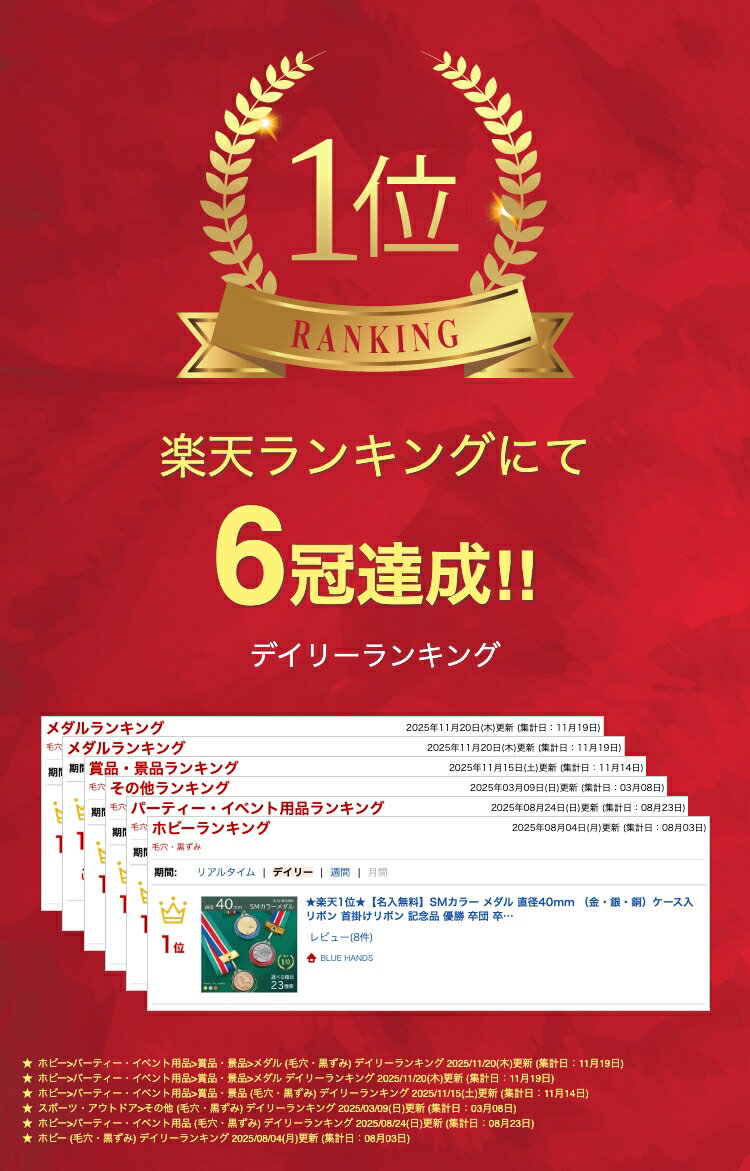 商品情報メダルサイズ直径40mmメダル重さ約20gプレートサイズ32×28mm種目23種類関連キーワードMVP/賞/地球/No.1/ハト/鳳凰/女神/ワシ/運動会/駅伝/トライアスロン/ランナー/陸上競技/アメリカンフットボール/グラウンドゴルフ/ゲートボール/ゴルフ/サッカー/サッカーBEST11/フットサル/スカッシュ/ソフトボール/卓球/テニス/ソフトテニス/ドッジボール/パークゴルフ/バスケットボール/バスケットボールBest5/バドミントン/バレーボール/ハンドボール/ビーチバレー/ビーチボール/ビリヤード/フットゴルフ/ペタンク/ボウリング/野球/野球Best9/ラグビー/ラクロス/合気道/空手道/弓道/剣道/銃剣道/柔道/相撲/テコンドー/フェンシング/ボクシング/レスリング/ウインドサーフィン/カイトボード/カヌー/サーフィン/水泳/水上バイク/スタンドアップパドルボード/ボート/ボディボード/ヨット/アイスホッケー/クロスカントリー/スキー/スキージャンプ/スキーモーグル/スノーボード/スピードスケート/フィギュアスケート/エアロビクス/クラシックバレエ/新体操/体操/ダンス/ダンスラテン/チアリーディング/トランポリン/フォークダンス/アーチェリー/クライミング/射撃/重量挙げ/乗馬/スケートボード/スラックライン/綱引き/ボルタリング/ローラースケート/一輪車/カーレース/自転車/BMX/モトクロス/音楽/カラオケ/ピアノエレクトーン/学習/作文コンクール/珠算/書道/川柳/短歌/俳句/囲碁/ウォーキング/園芸ガーデニング/絵画コンクール/カメラ/けん玉/座釣り/将棋/ダーツ/凧上げ/登山/花(菊)/百人一首/フィッシング/盆栽/麻雀/祭り/ミニレースカー/民謡/ヨーヨー/ラジコン/赤ちゃん/セールスマン/ドローン/ヘアーカット/料理/犬/馬/鯉/伝書鳩/肉牛/乳牛/猫/豚/QC/警察/自衛隊/消防署/消防団/トロフィー/カップ/ブロンズ/楯/表彰楯/クリスタル/ブロンズ/競技/趣味/娯楽/大会/大きい/重たい/豪華/金メダル/銀メダル/銅メダル/首掛け/表彰式/卒団/卒業/記念/記念品関連商品★楽天1位★【名入無料】SMカラー メダル 直径40mm (金・銀・銅...【文字彫刻無料】★楽天1位★ メダル (MJメダル)【金・銀・銅】 直...【名入無料】★楽天1位★ SMメダル 40mm Cセット PPケース(...611円890円1,072円【名入れ無料】★楽天1位★ メダル 直径63mm 【金・銀・銅】選べる...【文字彫刻無料】★楽天1位★ 表彰メダル(マイティメダル)【金・銀・銅...【名入無料】★楽天1位★ SMメダル 40mm Aセット プラスチック...2,390円1,500円1,144円【名入無料】 ★楽天1位★ LMメダル 53mm(金・銀・銅) プラス...【名入無料】★楽天1位★ LMメダル (金・銀・銅) プラスチックケー...【文字彫刻代無料】★楽天1位★ メダル 直径36mm 【金・銀・銅】 ...2,073円2,431円1,463円【名入無料】SMメダル 40mm Bセット プラケース(金・銀・銅)直...【文字彫刻代無料】 メダル 直径36mm 【金・銀・銅】 リボンなし ...【文字彫刻無料】 ★楽天1位★角型 メダル QM【金・銀・銅】記念品 ...965円924円1,337円★楽天1位★【名入無料】SMカラー メダル 直径40mm (金・銀・銅)ケース入 リボン 首掛けリボン 記念品 優勝 卒団 卒業 MVP ごほうび 景品 大会 スポーツ 部活 ケース付 名前入り イベント トロフィー 金メダル 銀メダル 野球 サッカー <直径40mm> 5
