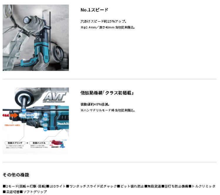マキタ 100V 18mm ハンマドリル HR1841F プラスチックケース付、ビット別売 商品説明 コンクリート小径穴あけを さらに速く より快適に!最速※&低振動 ※ 国内18mmクラスハンマドリル、小径穴あけにおいて 2017年10月現在、当社調べ。 ◆穴あけ能力(mm) : 鉄工 13 木工 24 コアビット 35 ダイヤモンドコアビット 65 ◆回転数(min-1)[回転/分] : 0〜2,100 ◆打撃数(min-1)[回/分] : 0〜4,800 ◆電源(V) : 単相100 ◆電流(A) : 5.0 ◆消費電力(W) : 470 ◆質量(kg) : 1.8 ◆振動3軸合成値※(m/s2) : 7.5(ハンマドリル) 3.0(ドリル) ◆機体寸法(長さ×幅×高さmm) : 285×75×208 ◆標準付属品 : ストッパポール・サイドグリップ ※ ハンマドリルはEN60745-2-6 ドリルはEN60745-2-1規格に基づき測定。 3Dプラス超硬ドリル ※掲載商品の仕様、デザイン、生産国、発売時期は 予告なく 変更する場合がありますので、 あらかじめご了承ください。 ※掲載画像の色彩は実際の商品及び印刷物と 多少異なる場合があります。 ※メーカー希望小売価格はメーカーカタログに 基づいて掲載しています。 発送詳細複数ご注文、またはメール便対応商品をご注文の場合は、ショッピングモールからの自動メールでは送料は確定しておりません。店舗よりメールにて確定送料をお知らせ致します。こちらの商品の送料は下記のとおりです。 ご注文確定前に必ずコチラをご確認の上ご購入をお願い致します・ご確認ください・配送について・返品、交換について{カテゴリ} マキタ makita MAKITA ハンマードリル ハンマー