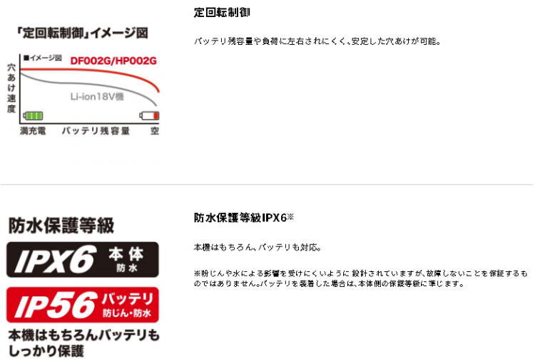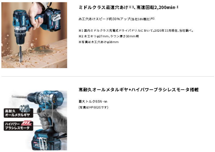 マキタ 40Vmax 充電式ドライバドリル DF002GZ バッテリ・充電器・ケース別売 商品説明 ミドルクラス最速の穴あけ※ ※2020年11月当社調べ。 高速回転2,200min-1で高効率 ◆穴あけ能力(mm) : 鉄工 13 / 木工 38 ◆ネジ締め能力(mm) : 木ネジ φ10×90 / 小ネジ M6 ◆チャック能力 : 1.5〜13 ◆回転数(min-1)[回転/分] : 高速 0〜2,200 低速 0〜600 ◆電圧(V) : 直流36(40Vmax)※1 ◆本体寸法(長さ×幅×高さmm) : 164×86×265 ◆質量(kg) : 1.9(BL4025装着時) ◆標準付属品 : プラスビット2-65・フック 1充電当たりの作業量(目安)/穴あけ※2 木工キリφ15mm ラワン(厚さ30mm) 約960本(高速) ※1 40Vmaxは満充電時のバッテリ電圧を表してます。 ※2 数値は参考値です。 バッテリの充電状態や作業条件により異なります。 ※掲載商品の仕様、デザイン、生産国、発売時期は 予告なく 変更する場合がありますので、 あらかじめご了承ください。 ※掲載画像の色彩は実際の商品及び印刷物と 多少異なる場合があります。 ※メーカー希望小売価格はメーカーカタログに 基づいて掲載しています。 発送詳細複数ご注文、またはメール便対応商品をご注文の場合は、ショッピングモールからの自動メールでは送料は確定しておりません。店舗よりメールにて確定送料をお知らせ致します。こちらの商品の送料は下記のとおりです。 ご注文確定前に必ずコチラをご確認の上ご購入をお願い致します・ご確認ください・配送について・返品、交換について{カテゴリ} makita MAKITA 充電式 コードレス
