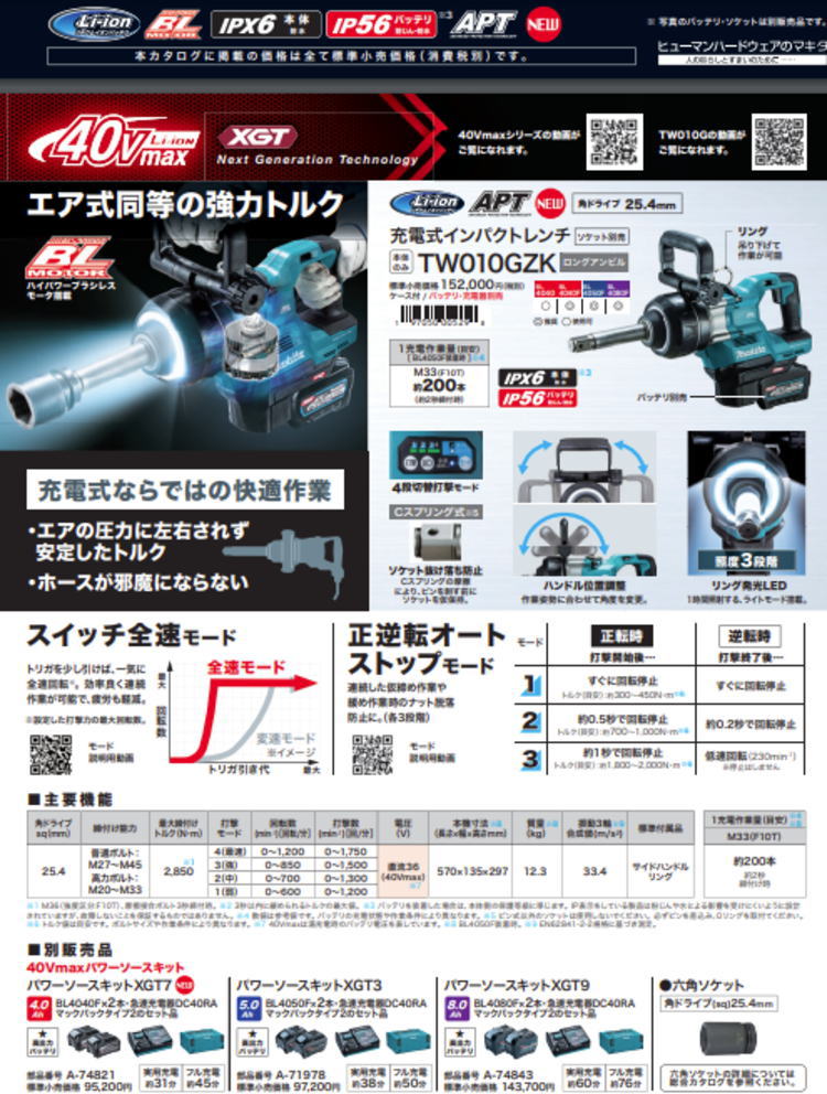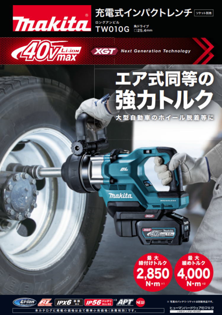 【送料込み ※一部地域除く】 マキタ 40Vmax 充電式インパクトレンチ TW010GZK バッテリ・充電器・別売 / ケース付 商品説明 エア式同等の強力トルク ロングアンビル仕様で大型自動車の ホイール脱着等に最適 ◆角ドライブsq(mm) : 25.4 ◆締付け能力 : 普通ボルト M27〜M45 高力ボルト M20〜M33 ◆最大締付けトルク(N・m) : 2,850 ◆回転数(min-1)(回転/分) : 最速 0〜1,200 強 0〜850 中 0〜700 弱 0〜600 ◆打撃数(min-1)(回/分) : 最速 0〜1,750 強 0〜1,500 中 0〜1,300 弱 0〜1,200 ◆電源(V) : 直流36(40Vmax) ※電源の補足 ※40Vmaxは満充電時のバッテリ電圧を表しています。 ◆振動3軸合成値(m/s2) : 33.4 ※振動3軸合成値の補足 ※EN62841-2-2規格に基づき測定。 ◆1充電作業量(目安) : 高力ボルト M33 (F10T) 約200本 締付け時間約2秒 ※1充電作業量の補足 ※数値は参考値です。 バッテリの充電状態や作業条件によって異なります。 ◆本機寸法(長さ×幅×高さmm) : 570×135×297 ◆質量(kg) : 12.3 ※質量の補足 ※BL4050F装着時。 ◆標準付属品 : サイドハンドル リング ※掲載商品の仕様、デザイン、生産国、発売時期は 予告なく 変更する場合がありますので、 あらかじめご了承ください。 ※掲載画像の色彩は実際の商品及び印刷物と 多少異なる場合があります。 ※メーカー希望小売価格はメーカーカタログに 基づいて掲載しています。 ※お取り寄せ品の返品は承れません。 よくお確かめの上でご注文をお願いいたします。 発送詳細複数ご注文、またはメール便対応商品をご注文の場合は、ショッピングモールからの自動メールでは送料は確定しておりません。店舗よりメールにて確定送料をお知らせ致します。こちらの商品(1点)の送料は下記のとおりです。 ご注文確定前に必ずコチラをご確認の上ご購入をお願い致します・ご確認ください・配送について・返品、交換について{カテゴリ} makita MAKITA 充電式 充電 コードレス インパクト インパクトレンチ