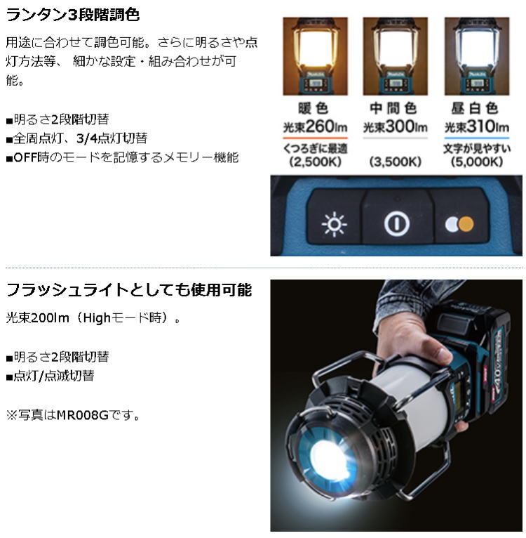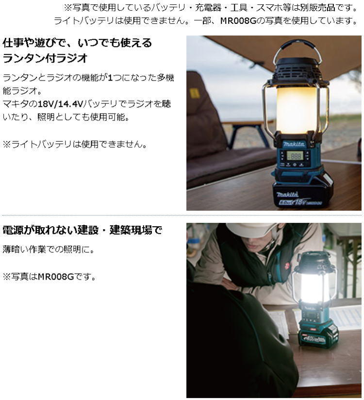 マキタ 18V & 14.4V 充電式ランタン付ラジオ MR054DZ バッテリ・充電器別売 商品説明 ランタンとラジオが1つに 仕事や遊びで聴く&照らす。 ◆電源(V) : 直流18V/14.4V ◆本機寸法(長さ×幅×高さmm) : ※1 126×129×289 ※2 ◆質量(kg) : 0.97 ※3 ◆標準付属品 : フック付ストラップ ★ ラジオ部 ★ ◆周波数帯域 : FM:76〜108MHz AM:522〜1,710kHz ◆アンテナ : FM:アンテナ兼用ランタンレンズガード AM:内蔵バーアンテナ ◆スピーカー : 57mm ◆実用最大出力 : 3.0W / 2.4W (18V/14.4V) ★ ランタン部 ★ ◆ランタン(LED) : 暖色、昼白色 各20灯 ◆フラッシュライト : LED昼白色 1灯 ※1 キャリーハンドルを倒したとき。 ※2 BL1860B装着時。 ※3 バッテリ非装着時。 ※掲載商品の仕様、デザイン、生産国、発売時期は 予告なく 変更する場合がありますので、 あらかじめご了承ください。 ※掲載画像の色彩は実際の商品及び印刷物と 多少異なる場合があります。 ※メーカー希望小売価格はメーカーカタログに 基づいて掲載しています。 発送詳細複数ご注文、またはメール便対応商品をご注文の場合は、ショッピングモールからの自動メールでは送料は確定しておりません。店舗よりメールにて確定送料をお知らせ致します。こちらの商品の送料は下記のとおりです。 ご注文確定前に必ずコチラをご確認の上ご購入をお願い致します・ご確認ください・配送について・返品、交換について{カテゴリ} makita MAKITA コードレス 充電式 LED ライト ラジオ