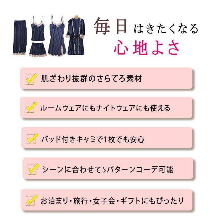 【最大20%OFFクーポン】 ルームウェア レディース 5点セット パジャマ サテン さらてろ シルクタッチ 接触冷感 ナイトウェア キャミソール ガウン ワンピース パッド付き ショートパンツ ロングパンツ 夏 セクシー 高級感