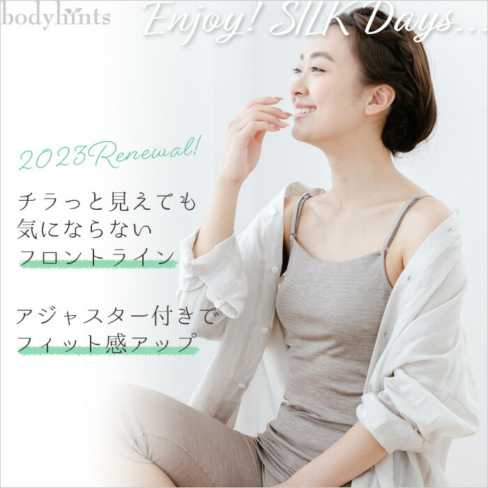 日々の暮らしにやさしい下着のお店「bodyhints(ボディヒンツ)」オリジナル フィット感抜群のシルクフライス編みインナーシリーズ。 【2023年リニューアル】(旧R079) 肩紐にアジャスターをつけて、お好みのフィット感に調節可!寝転がっても背中にアジャスターが当たらないため、おやすみインナーにも最適☆ 胸元は、見えても気にならないフロントラインにリデザイン♪ ◆シルク100%フライス カップ付きキャミソールのこだわり フロントのみアンダーゴム仕様のため、一般的なカップ付きブラのアンダーゴムによる締め付けがなく、1日中快適に過ごすことができます。 カップを外すと普通のキャミソールとして使えたり、おうちでのルームインナーや、就寝時おやすみ用インナーとしても幅広く使えます。 丸編みフライス生地のため、脇回りスッキリ、ストレスフリー! 細身にみえますが、非常にヨコ伸びがいい生地のため、着脱らくちん。 ゴムが肌に触れることが一切ないため、天然繊維の王様・シルク繊維だけを身に着けている解放感と心地良さは、他のインナーとは比べものになりません。 どのカラーもシルクの先染め杢糸を採用しているので見た目がとてもおしゃれです。透け感が少ないので1枚で着用もOKです♪ ★お肌が喜ぶ♪シルクを身に着けると良いことたくさん 春夏秋冬、年中使える万能シルク素材。 優れた吸湿性・放湿性を兼ね備え、静電気も起こりにくく、話題の「冷えとり」に最適です。 敏感肌の方も安心の低刺激で肌にやさしい自然素材。 人間の皮膚と同じタンパク質(18種類のアミノ酸)から構成されていて、軽くてなめらかな肌触り。 人間の肌ととても相性が良い素材です。 ボディヒンツ独自の生地を使用しているので、摩擦に弱いシルク素材でも毎日おうちで洗濯できます。 高品質のシルク100%なのに、メーカー直販のためお求めやすい価格でリピーター続出! ◆カップ付きタンクトップタイプはこちら⇒ ◆ウレタンブラカップが苦手な方へ…蒸れにくい!コットンガーゼパッドはこちら⇒ ◆商品詳細 【生産国】日本製 【素材】シルク100%(170双極細絹糸フライス)※縫い糸はシルクではありません。 【カラー】杢ブラック・杢グレー・杢モカ・杢オレンジ・杢シトラス 【カップ】ウレタンカップ(正円タイプ・出し入れ可) 【バストサイズ】M(79-87cm)・L(86-94cm) 【平置き寸法】総丈 / アンダー幅 / 肩紐 M:64cm / 30cm / 23cm L:66cm / 33cm / 24cm ※肩紐アジャスターを5cmに調整して計測 ※こちらの商品は【1点までメール便配送】可能商品です。2点以上や他商品も一緒に注文した場合は、宅配便をご選択ください。 [関連ワード] キャミソール単品 キャミソールインナー キャミソールランジェリー シルク肌着 シルク服 シルク部屋着 シルク100パーセント 絹の下着 シルクインナー シルク安い シルクランジェリー シルク寝巻き シルクパジャマ シルク伸びる シルク美肌 ブラトップ リラックスブラ ヨガウェア シルク下着 シルク肌着 夏肌着 春夏インナー 汗とりインナー 蒸れない下着 あせも対策 着物用下着 和装下着 振袖下着 シルクの下着 下着かぶれ 痒くならない下着 透け防止 うるおい保湿 トップス セットアップ ルームウェア 女性下着 ストレッチ ファッション レディース 女性 楽天ファッション 冷え対策 冷房対策 乾燥 生地 シンプル ルームウェア リラックス かわいい 可愛い おしゃれ お洒落 おすすめ 肌荒れ 肌にやさしいインナー 3,980円以上 送料無料 敬老の日 敬老の日ギフト 敬老の日プレゼント 出産祝い お誕生日プレゼント お祝い 御祝い バースデイ クリスマスプレゼント Xmas 贈り物 20歳 30歳 40歳 50歳 60歳 70歳 20代 30代 40代 50代 60代 70代 プレゼント 30代女性プレゼント 40代女性プレゼント 50代女性プレゼント 60代女性プレゼント ママ 妊婦 マタニティ 母の日 bodyhints ボディヒンツ ボディヒんつ タカギ タカギ下着 メーカー直販 肌にやさしい 天然素材 天然繊維 インナー 下着 肌着 レディース ショーツ プレゼント ギフト プチギフト プチご褒美 天然繊維 天然素材 肌荒れ予防 美肌ケア しめつけない下着 肌に優しい下着 敏感肌におすすめ 敏感肌用 低刺激 国産 タカギ タカギ下着 黒 灰色 グレイ ベージュ japanmade【リニューアル!脇に縫い目の無い日本製シルク100%フライス★おうちで洗えるカップ付キャミソール】 ▼シルク天竺編みとフライス編み、どう違うの?とお悩みの方へ。伸びの確認☆ 日々の暮らしにやさしい下着のお店「bodyhints(ボディヒンツ)」オリジナル フィット感抜群のシルクフライス編みインナーシリーズ。 【2023年リニューアル】(旧R079) 肩紐にアジャスターをつけて、お好みのフィット感に調節可!寝転がっても背中にアジャスターが当たらないため、おやすみインナーにも最適☆ 胸元は、見えても気にならないフロントラインにリデザイン♪ ◆シルク100%フライス カップ付きキャミソールのこだわり フロントのみアンダーゴム仕様のため、一般的なカップ付きブラのアンダーゴムによる締